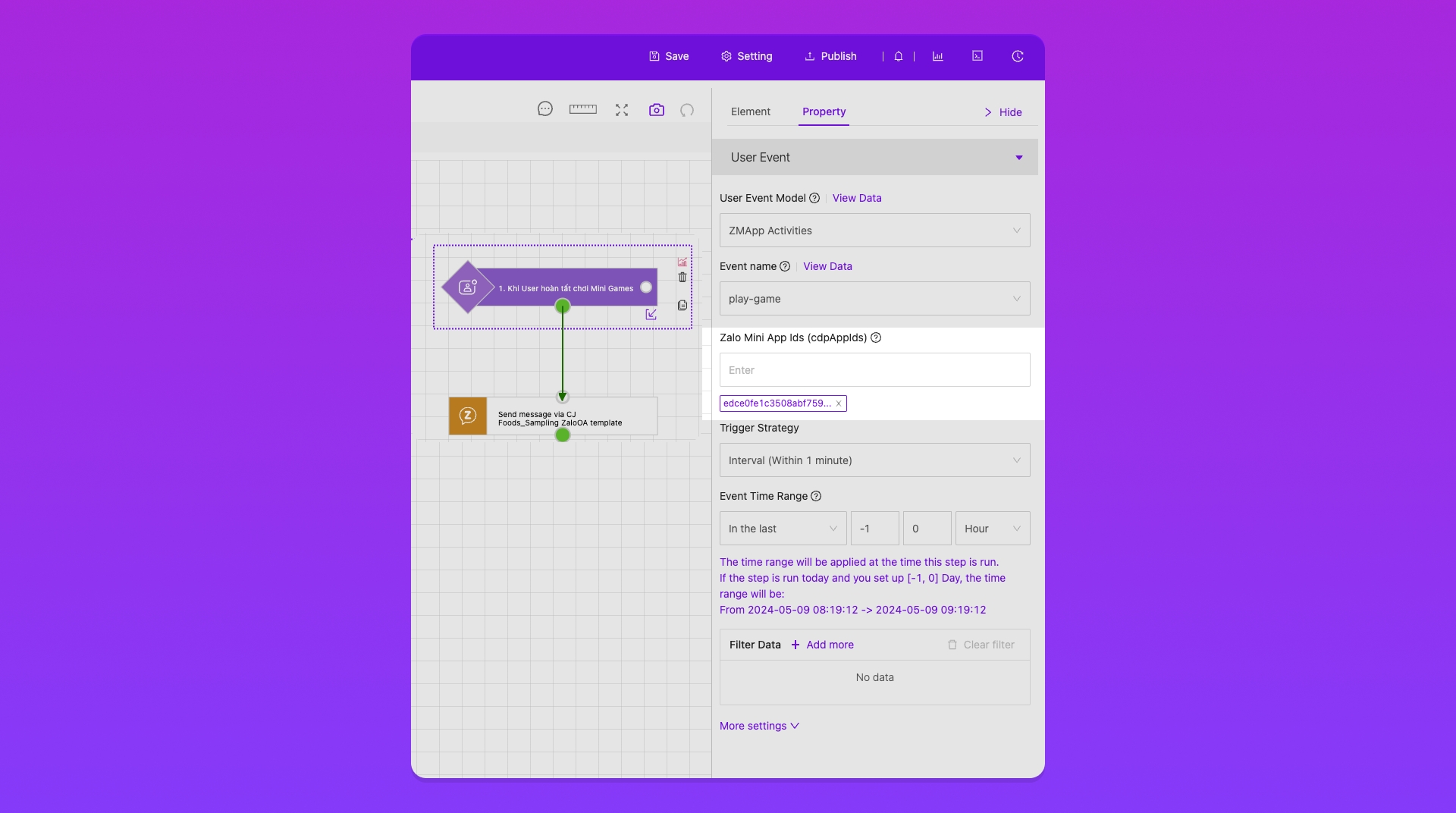 Trước đây khi cài đặt một kịch bản tự động với Trigger "Start with" sử dụng Element: User Event và lựa chọn loại Model là ZMApp Activities, bạn cần vào trường Filter, chọn Label2, và nhập CDP App ID của Mini App tương ứng. Quá trình này giúp lọc ra các tương tác của người dùng được tổng hợp trong Module CDP dưới Menu Social - ZMApp Activities từ Mini App đã chỉ định. Bước này rất quan trọng để tạo ra một hành động (Job) thực thi kịch bản dựa trên những tương tác đó.