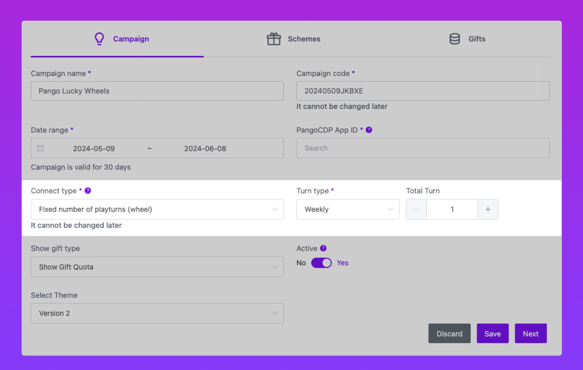 Công cụ Pango Wheels tại Module Activations - Connect type: Fixed number of playturns (wheel) hỗ trợ thêm Turn type: Weekly. Cấu hình này tạo lượt chơi trên Pango Wheels mới mỗi tuần. Mốc thời gian quy định để đặt lại: 07 giờ 00 phút sáng ngày thứ 2 hằng tuần.