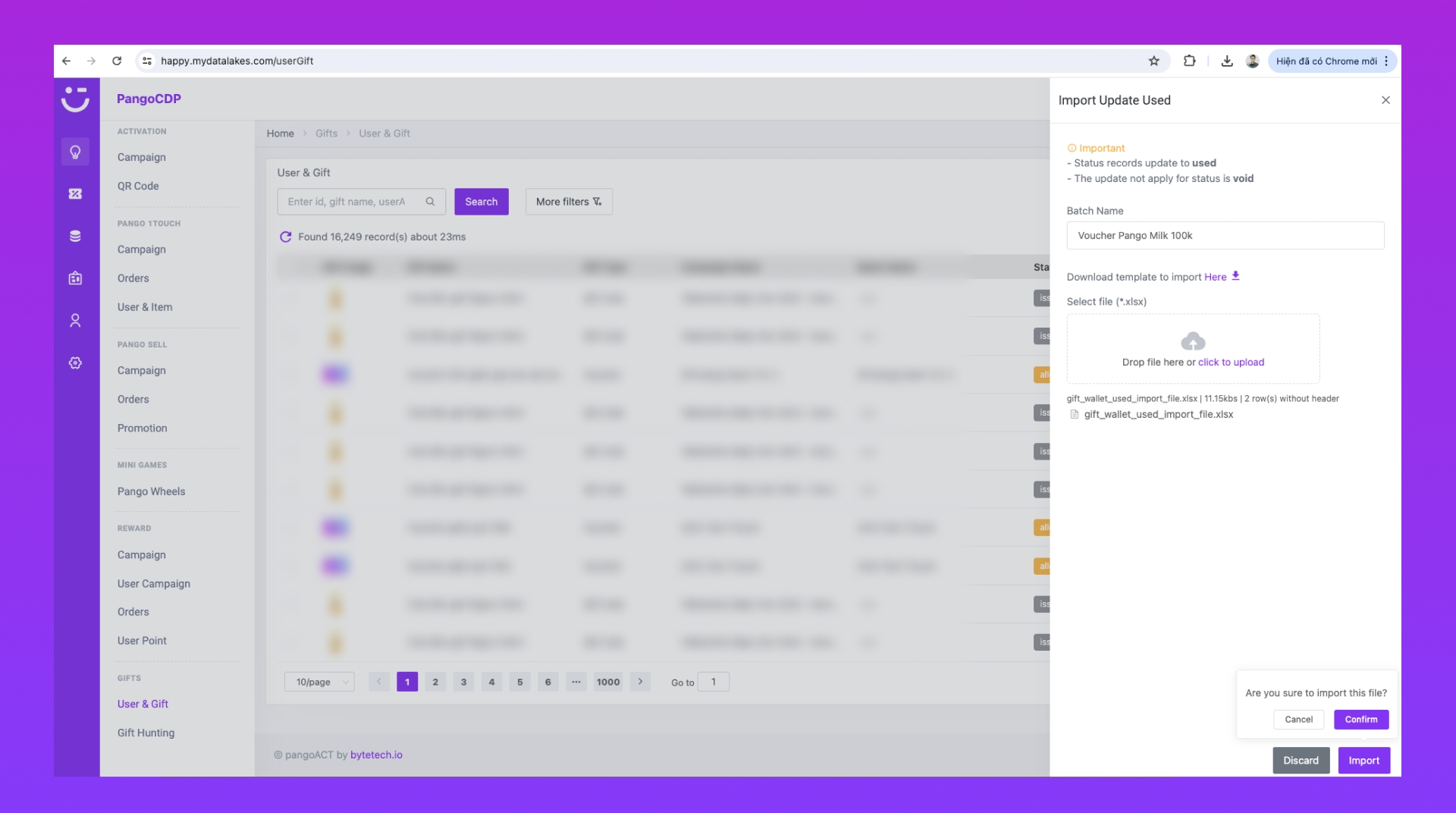 Từ đó, phát triển tính năng cập nhật trạng thái thủ công trạng thái của Voucher thành "Used" để tránh gây hoang mang trong việc sử dụng công cụ Pango Gift và thực hiện các kịch bản nhắc nhở tự động hiệu quả hơn.