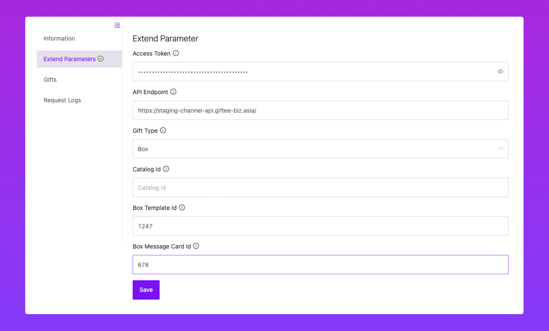 để hoàn tất nội dung Extend ParametersAccess Token: mã kết nối do Giftee cung cấp