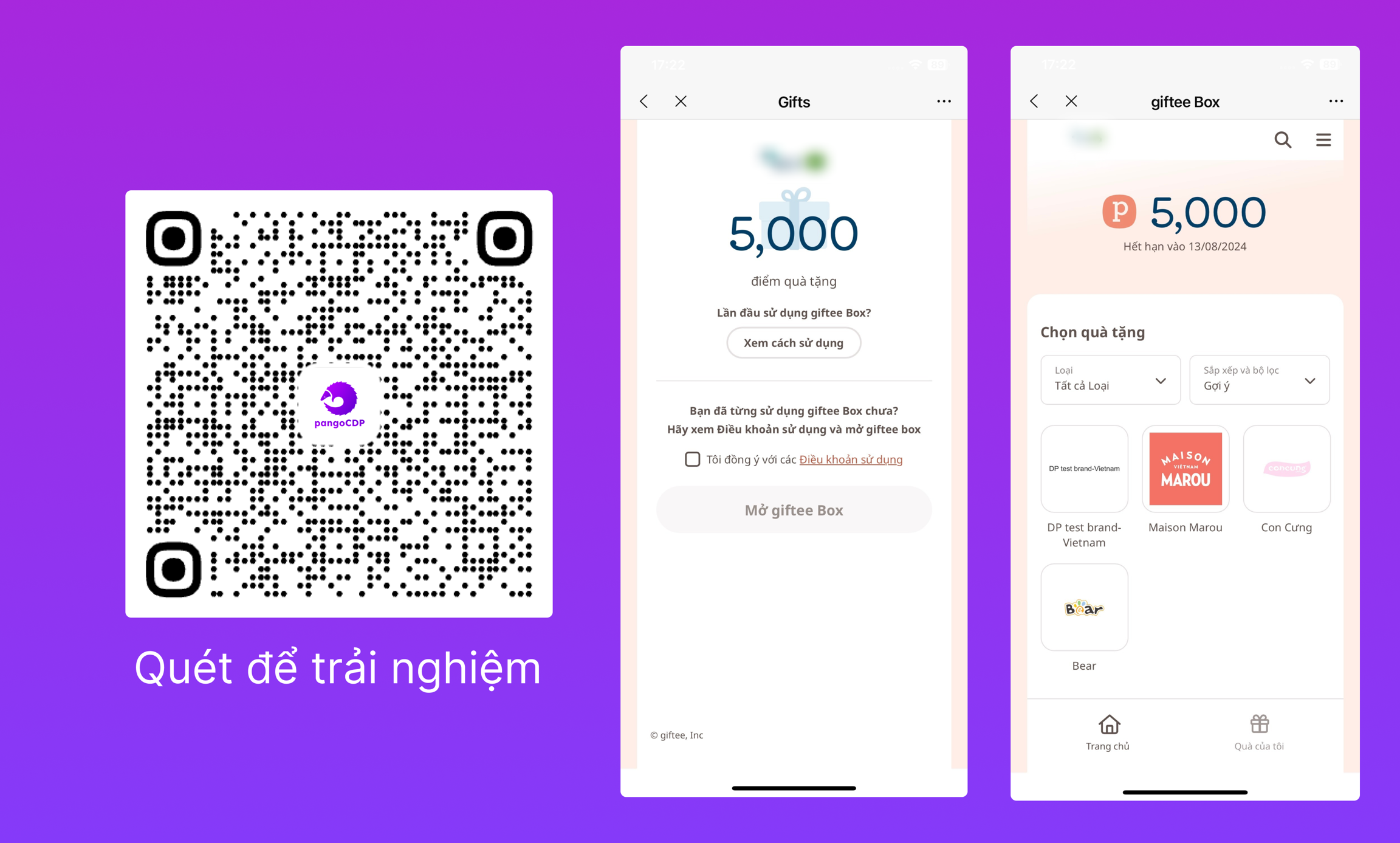 PangoCDP hợp tác với Giftee để giới thiệu một loại quà tặng mới, cho phép khách hàng nhận điểm thưởng và đổi lấy các Voucher từ danh sách có sẵn. Điều này giúp khách hàng linh hoạt hơn trong việc lựa chọn Voucher phù hợp với nhu cầu mua sắm của họ.