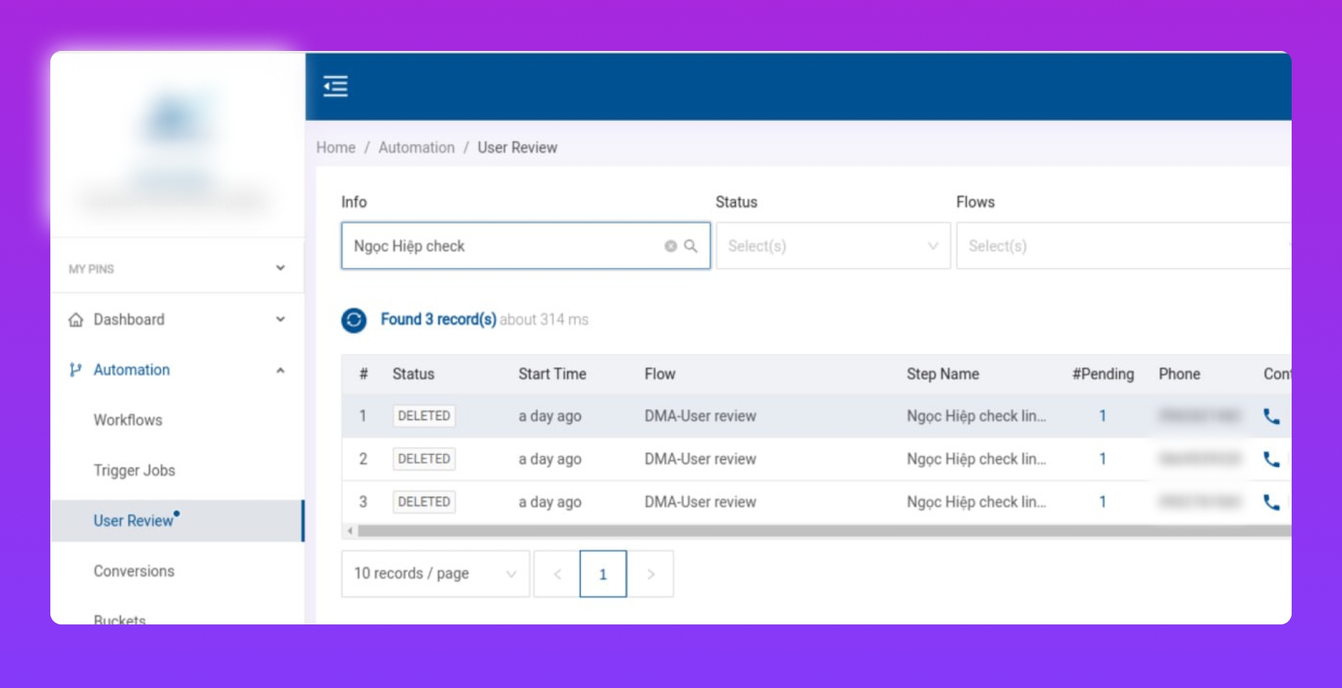 Trong Module DMA -> Menu Automation -> Submenu: User Review có thể search tại Info với keyword là Step Name để tìm kiếm các record theo Step đó.