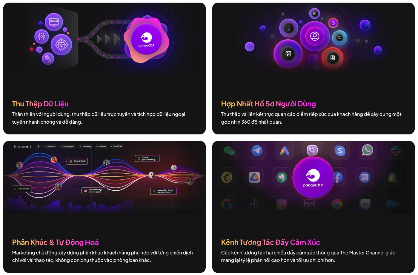 Hầu hết các nền tảng CDP (Customer Data Platform) cần kết nối với nhiều kênh giao tiếp như Email, SMS, WhatsApp… để tương tác với khách hàng. PangoCDP không chỉ dừng lại ở việc hợp nhất và phân tích dữ liệu người dùng như các CDP thông thường, PangoCDP nổi bật với khả năng tích hợp sâu cùng các Super App, mang đến trải nghiệm không giới hạn dựa trên hồ sơ khách hàng 360 độ.