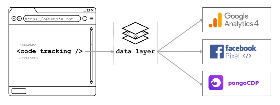 PangoCDP cung cấp đoạn mã <Code tracking> để bạn gắn vào website, thông qua đoạn mã này Pango sẽ ghi nhận các dữ liệu từ webiste như thông tin cookie của user, thông tin tương tác của họ như xem trang, bấm vào các mục có gắn sự kiện trên site, thông tin về nguuồn truy cập của user.