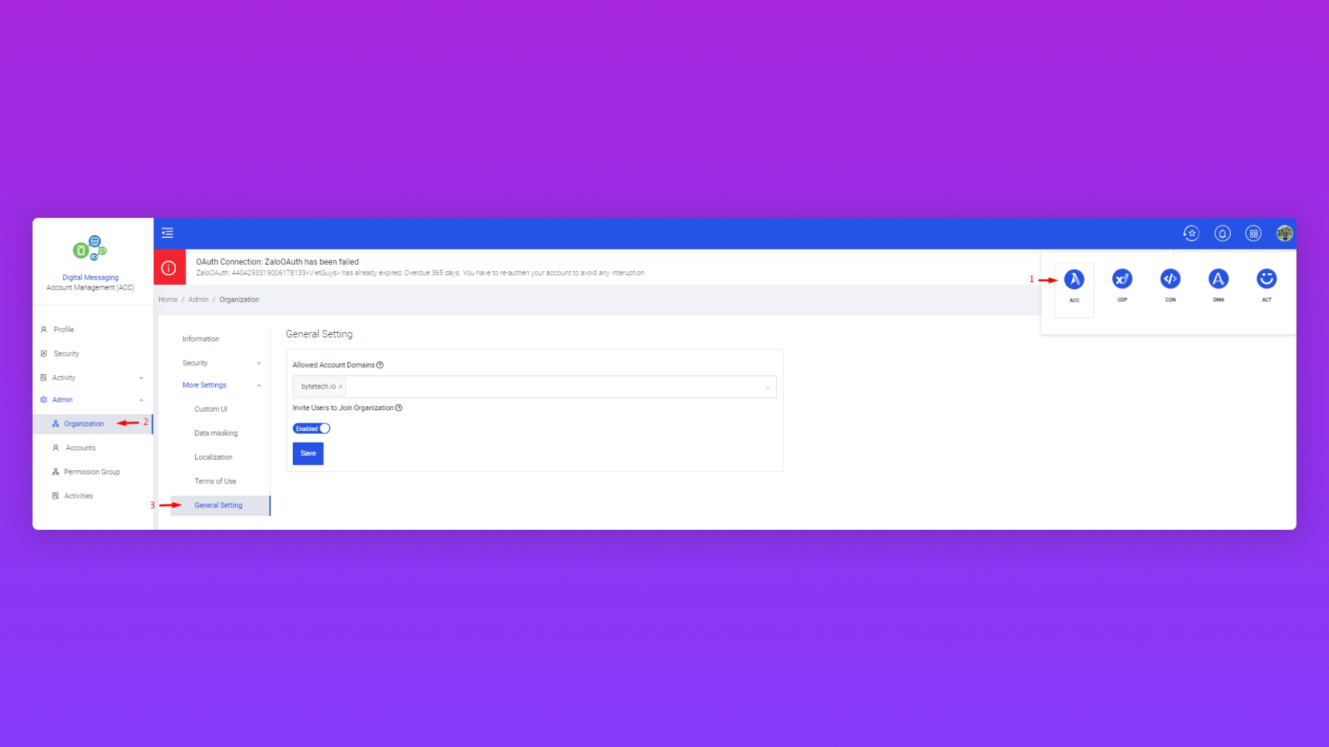 bật chức năng mời người dùng mới (tài khoản người dùng mới này đã có trên nền tảng PangoCDP trước đó ở một ORG khác)