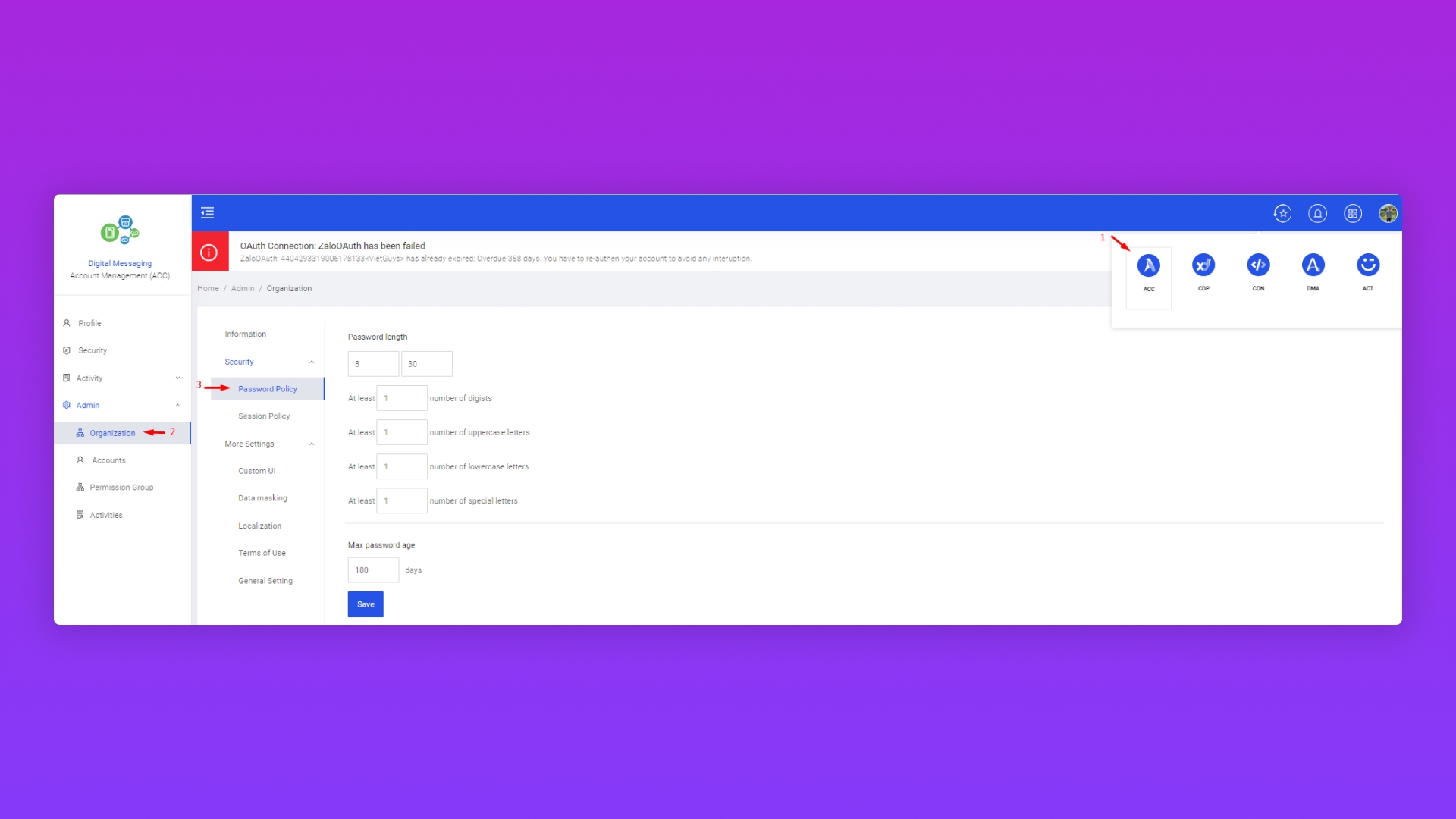 Vào Admin - Organization