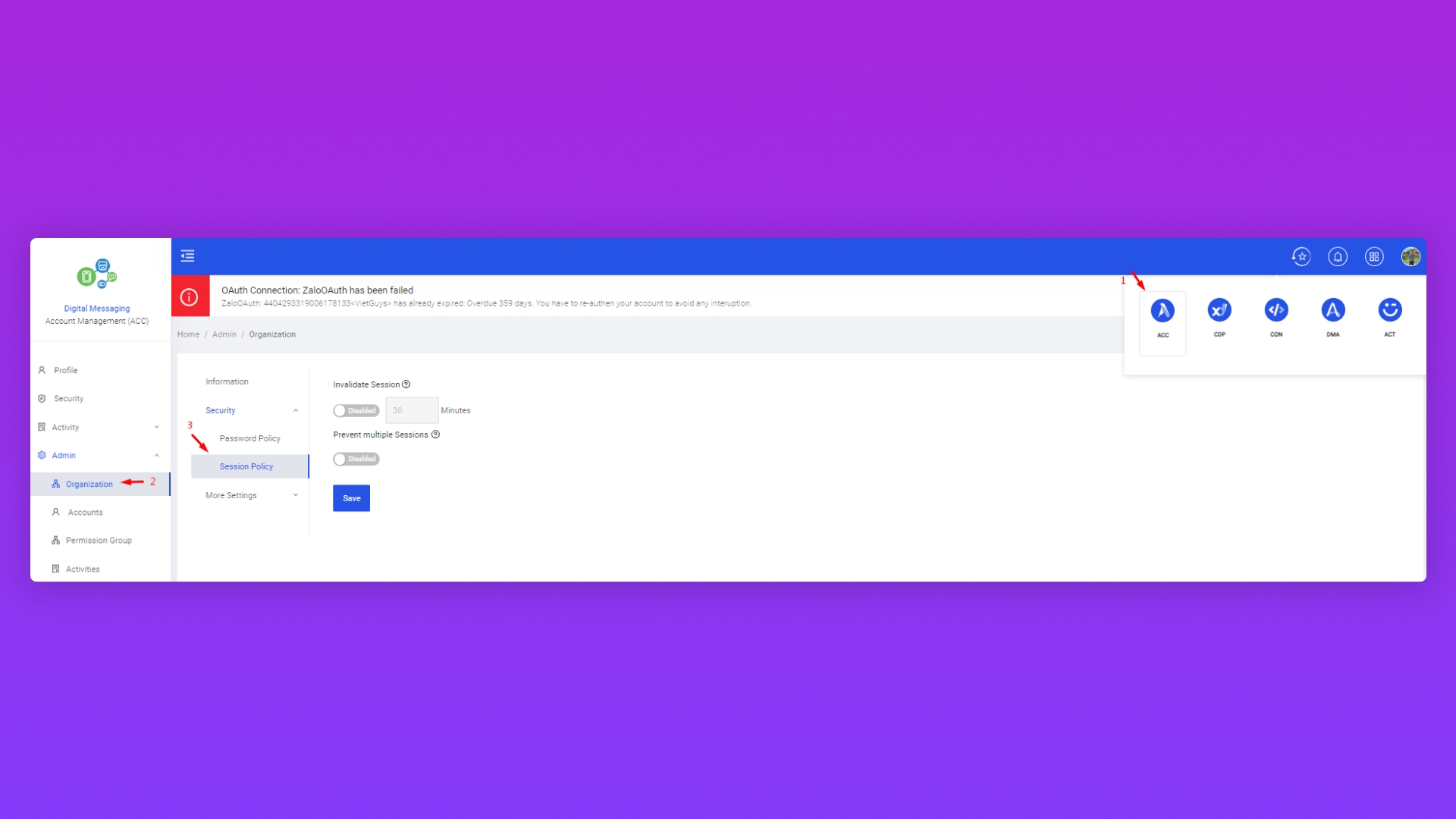 Click Admin / Organization
