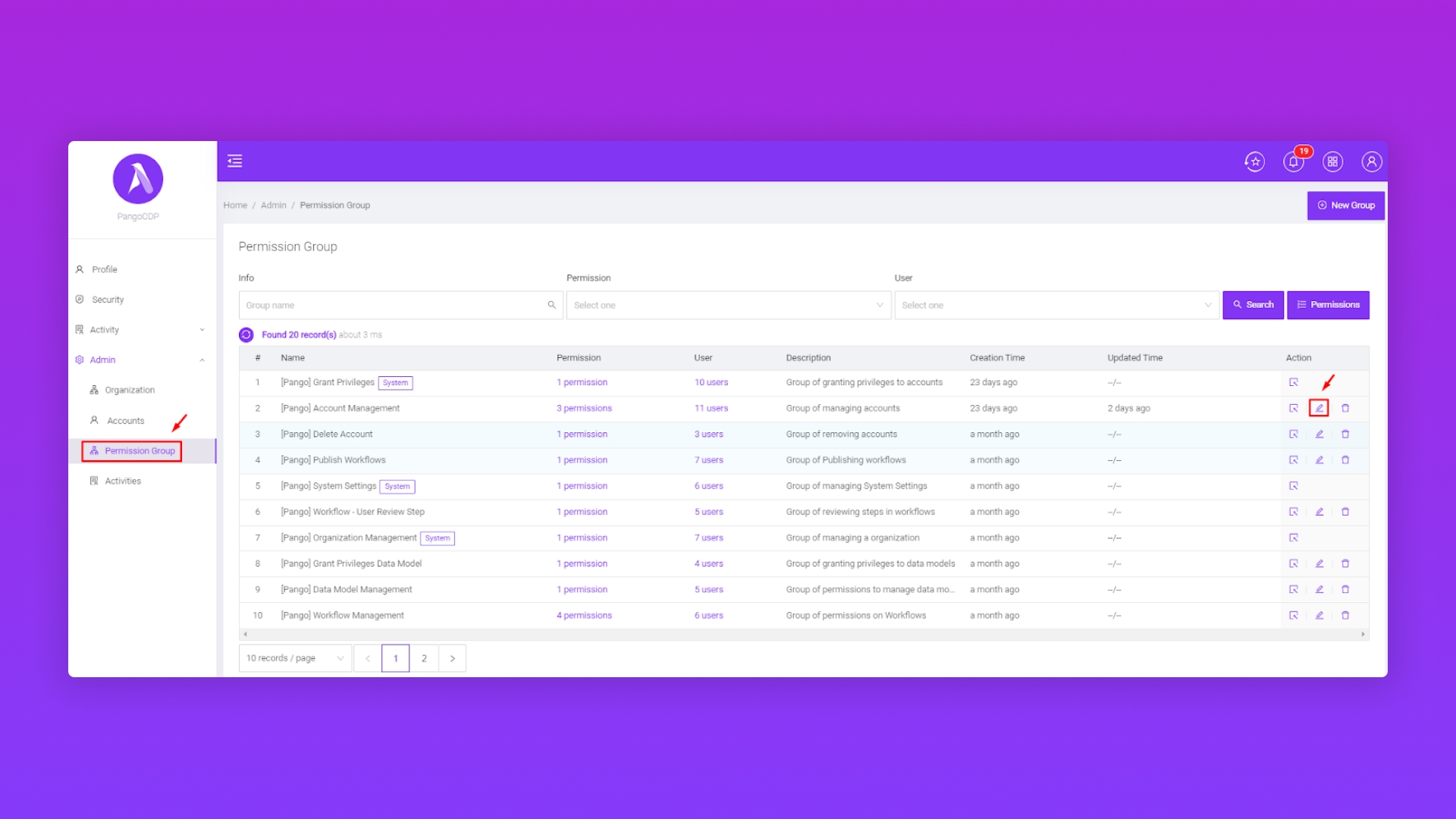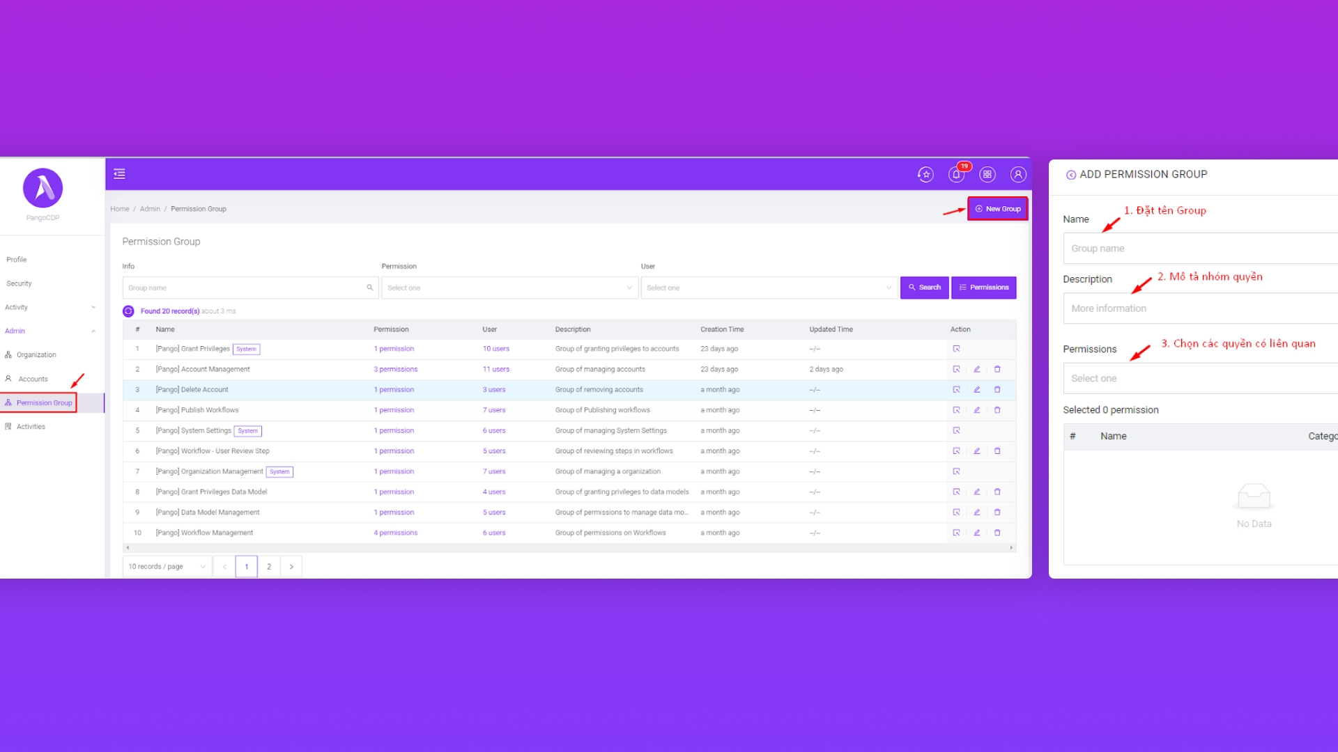 Tài liệu này hướng dẫn chi tiết cách tạo và phân quyền cho người dùng trong hệ thống PangoCDP thông qua việc thiết lập Permission Group (nhóm quyền). Việc phân quyền giúp kiểm soát các hành động người dùng có thể thực hiện trong hệ thống, đảm bảo bảo mật và phân tách vai trò rõ ràng giữa các bộ phận. Tài liệu bao gồm các bước thao tác trực quan từ việc tạo Role cho tài khoản đến việc phân quyền cụ thể cho từng nhóm người dùng.