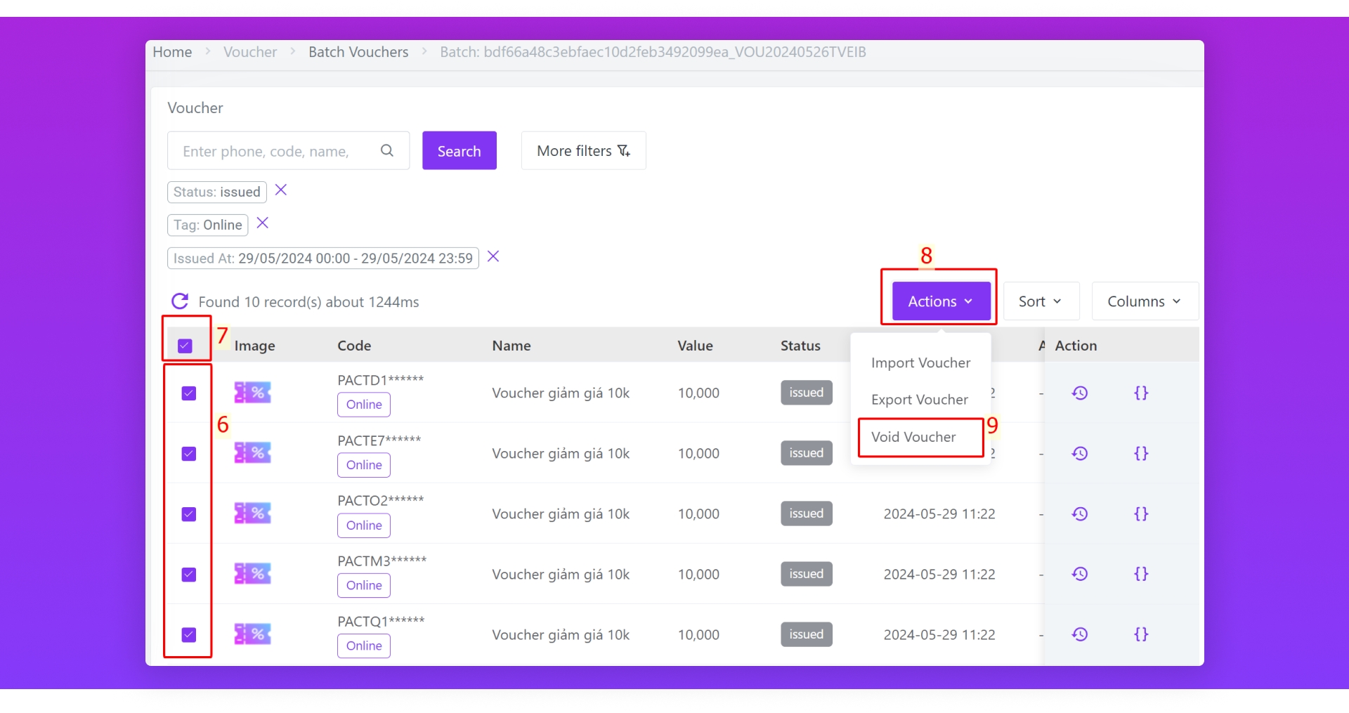 Chọn trang thái của voucher là issued để hủy các voucher chưa được phát ra trong batch này