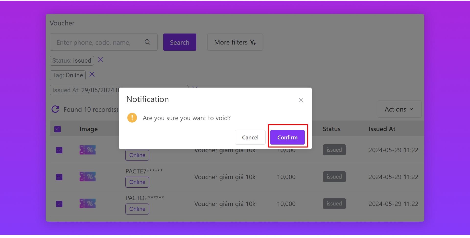 Chọn Confirm thì hệ thống sẽ bắt đầu hủy voucher đã chọn