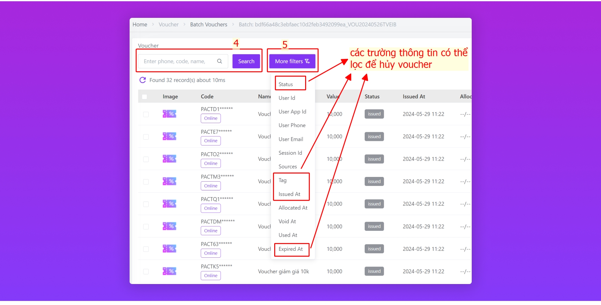 Hoặc tìm các voucher theo điều kiện bạn muốn lọc và hủy. Để lọc theo các điều kiện khác, bạn chọn nút More filters (5) và chọn các trường thông tin hệ thống hỗ trợ lọc như sau: