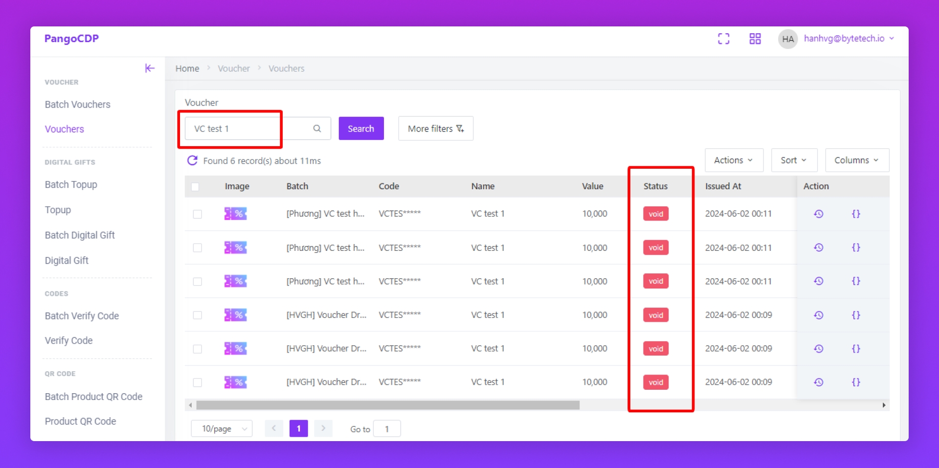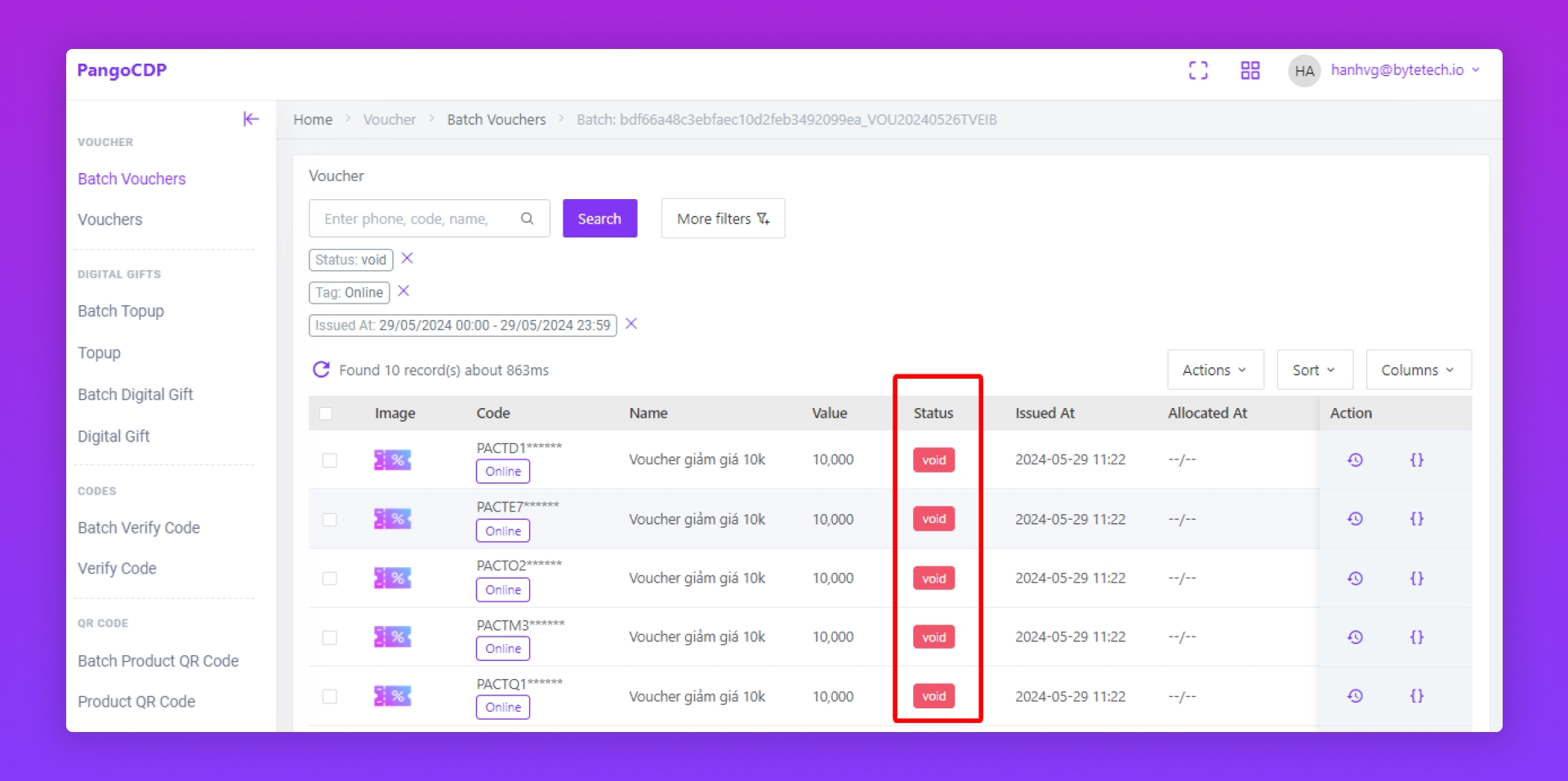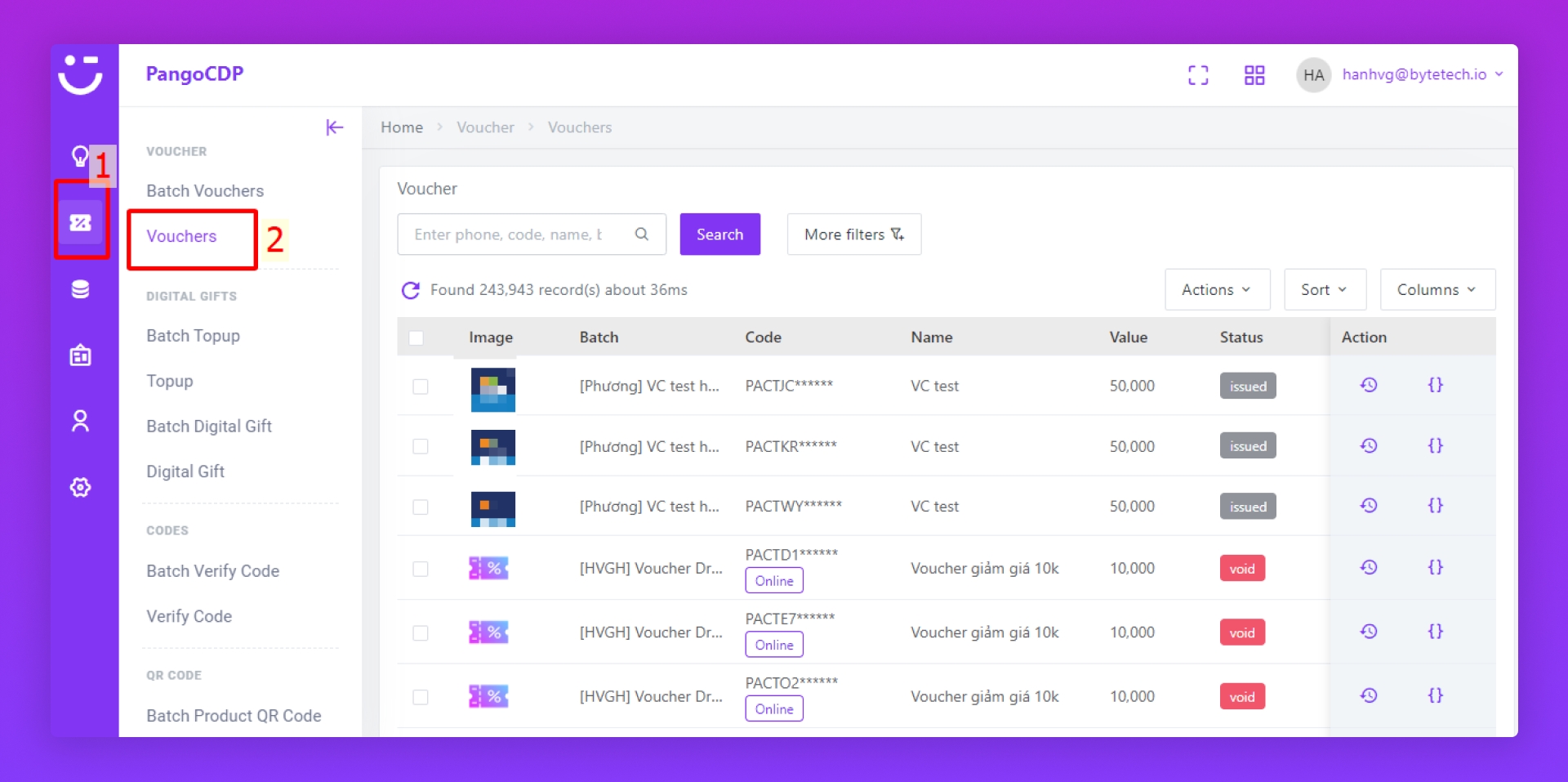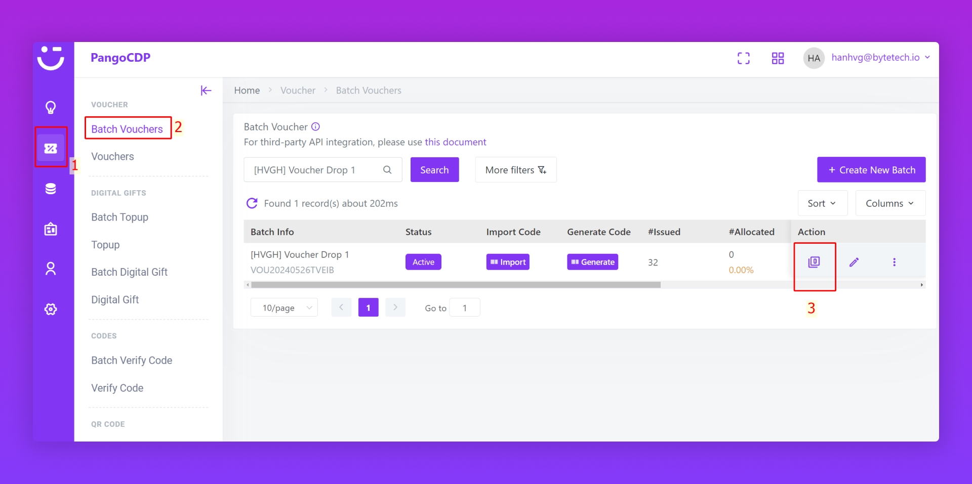 Bấm icon Vouchers (3) trong Action để xem danh sách voucher trong Batch