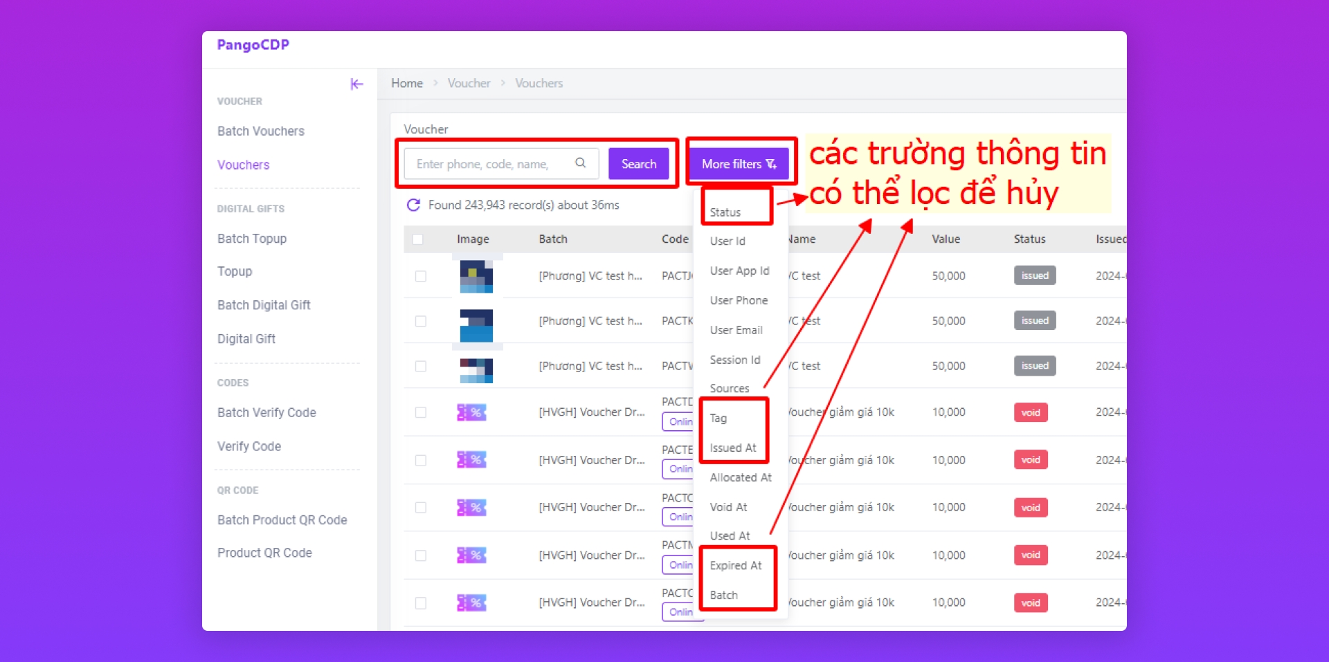 Tương tự như cách 1, có thể tìm kiếm theo tên, mã voucher và các điều kiện khác như trạng thái voucher (Status), nhãn gán voucher (Tag), thời gian tạo voucher (Issued At), thời gian hết hạn voucher (Expired At) và đặc biệt có thêm một trường khác với cách 1 là lọc theo batch voucher (Batch)