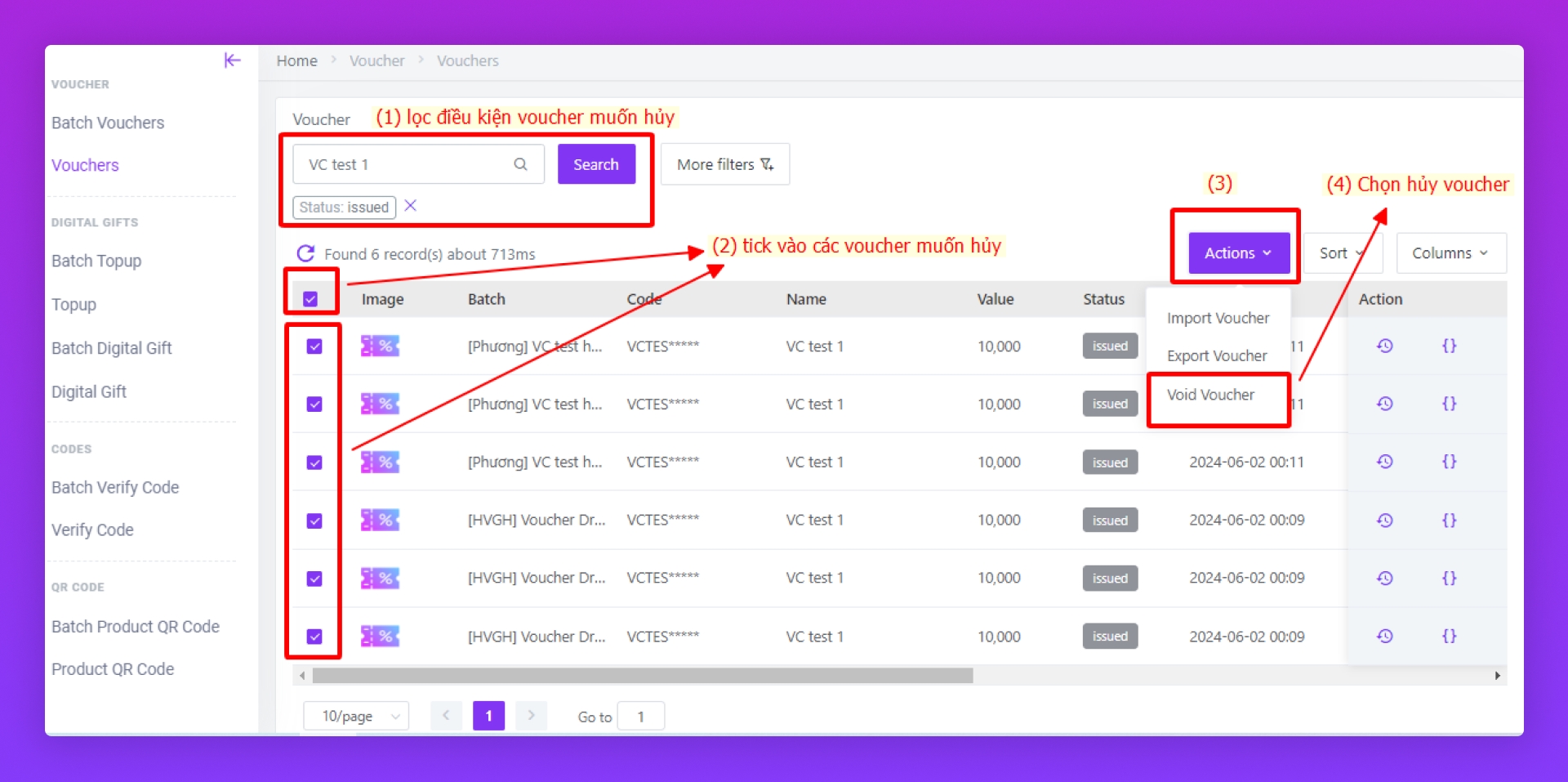 Cách 1: Huỷ voucher trong một Batch Voucher cụ thể