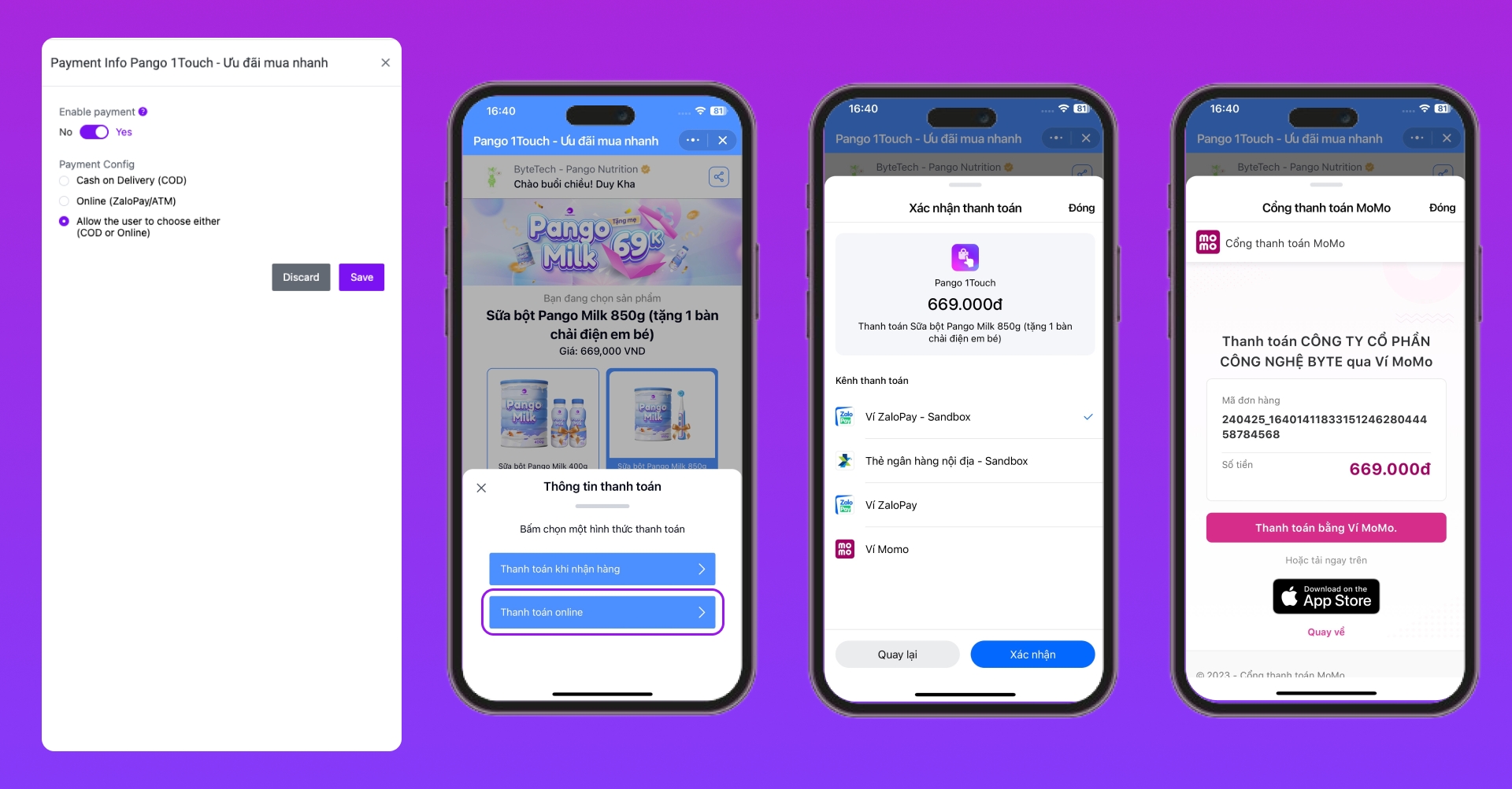 Online (ZaloPay/Momo/ATM): sử dụng các nền tảng thanh toán Online để thanh toán đơn hàng ngay tại thời điểm đặt hàng