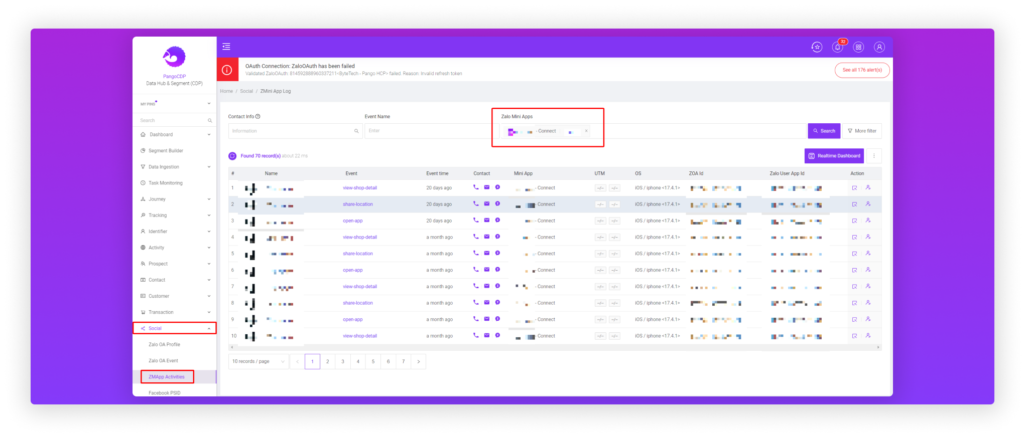 Tài liệu hướng dẫn người dùng các thông tin event trả về từ miniApp Pango Connect trên PangoCDP Platform