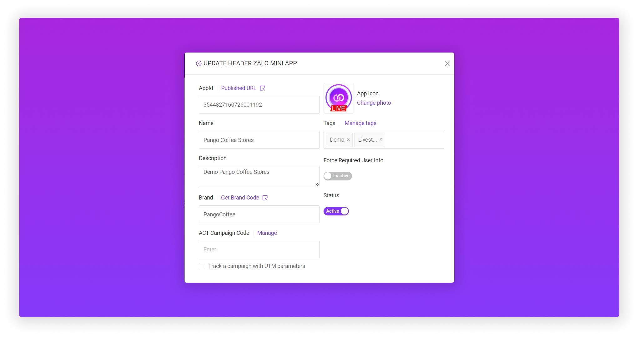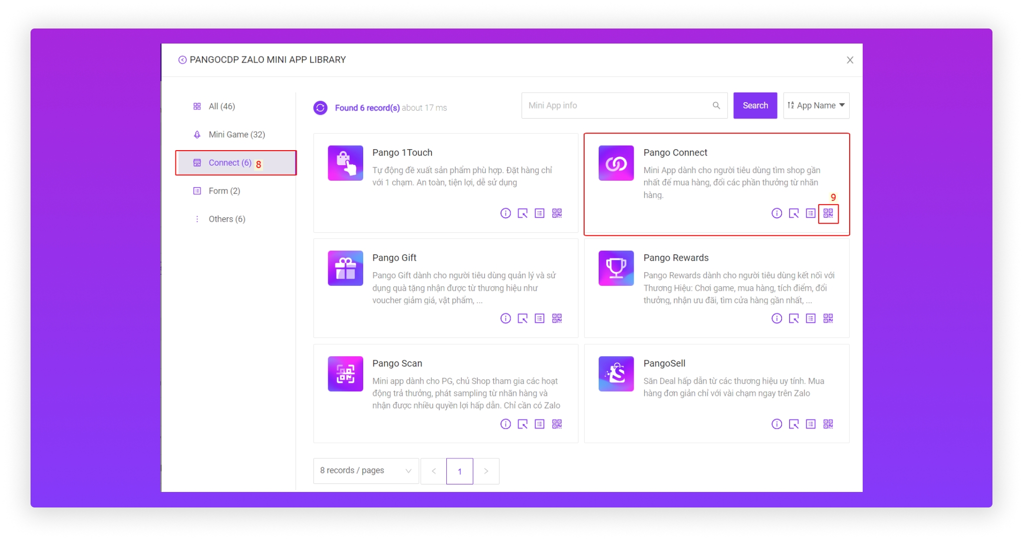 Tên của mini App Pango Connect để quản lý trên list Mini App