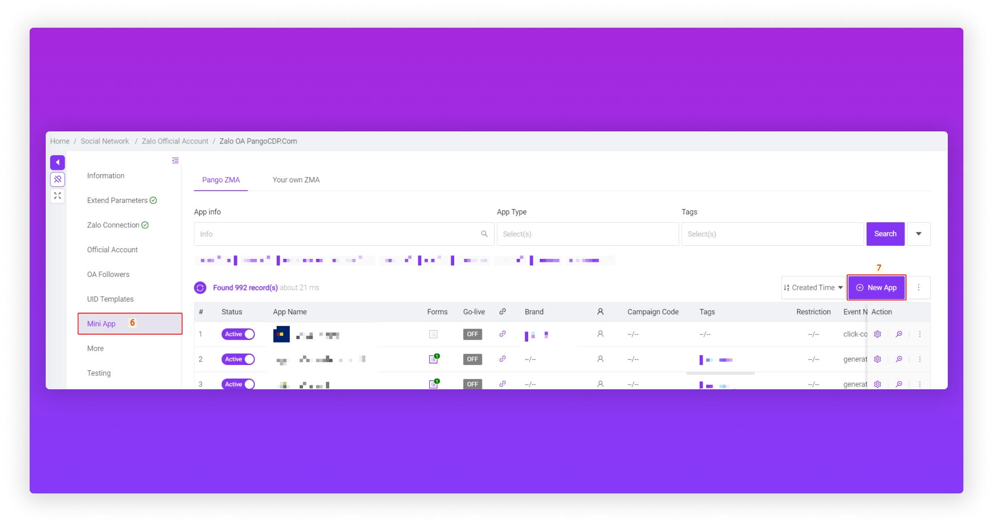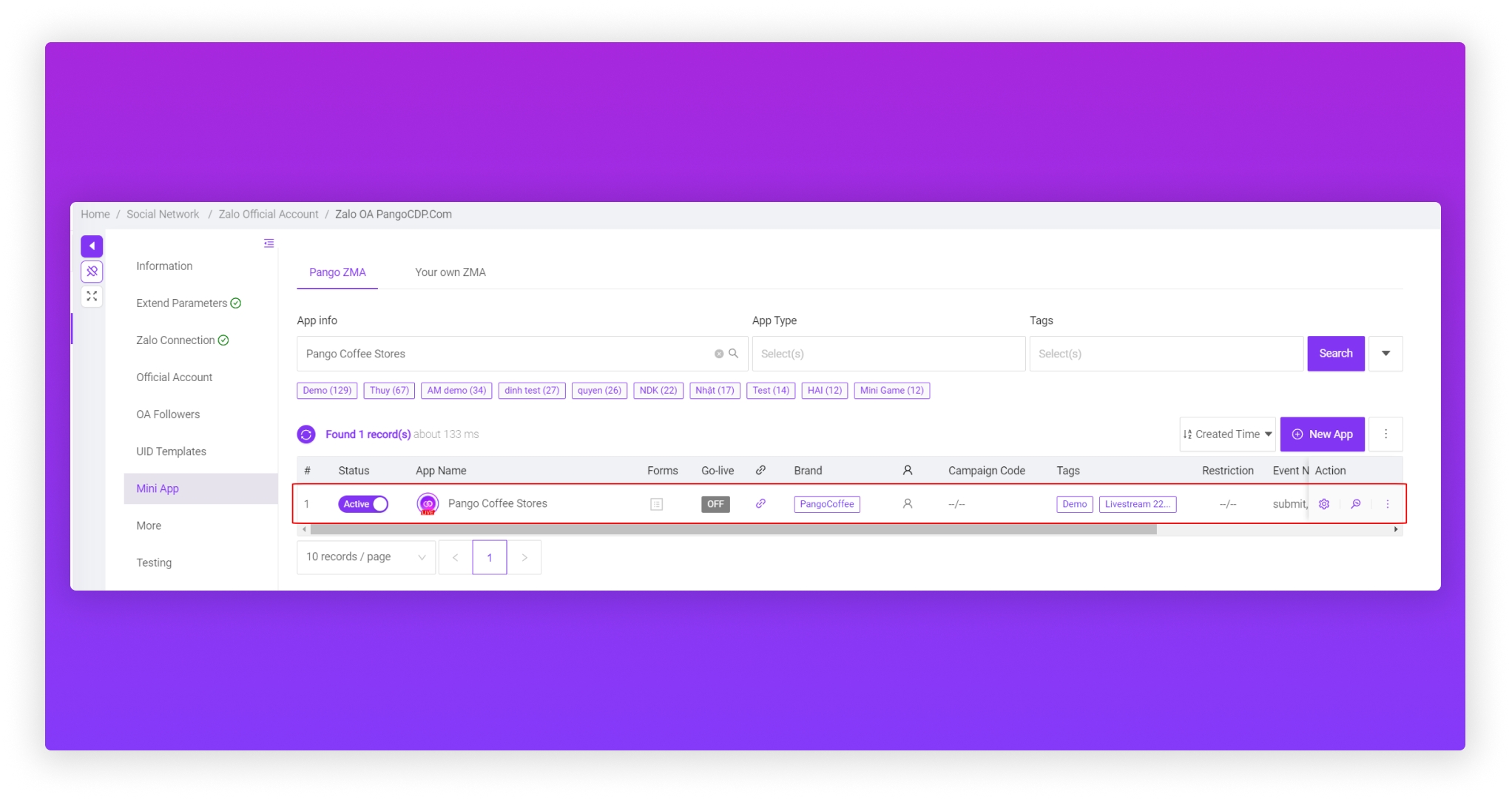 Sau khi tạo sẽ có một mini App xuất hiện ở danh sách mini App: