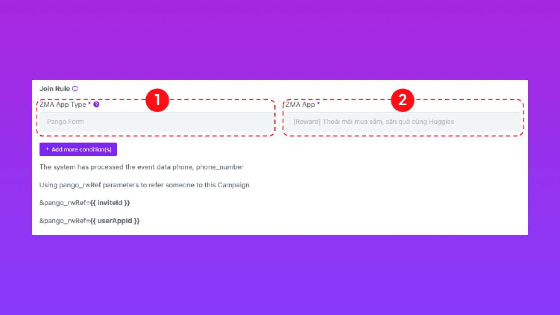 + Add more condition(s): thêm điều kiện để kiểm tra Join Rule khi nhận thông tin phản hồi từ app ngoài.