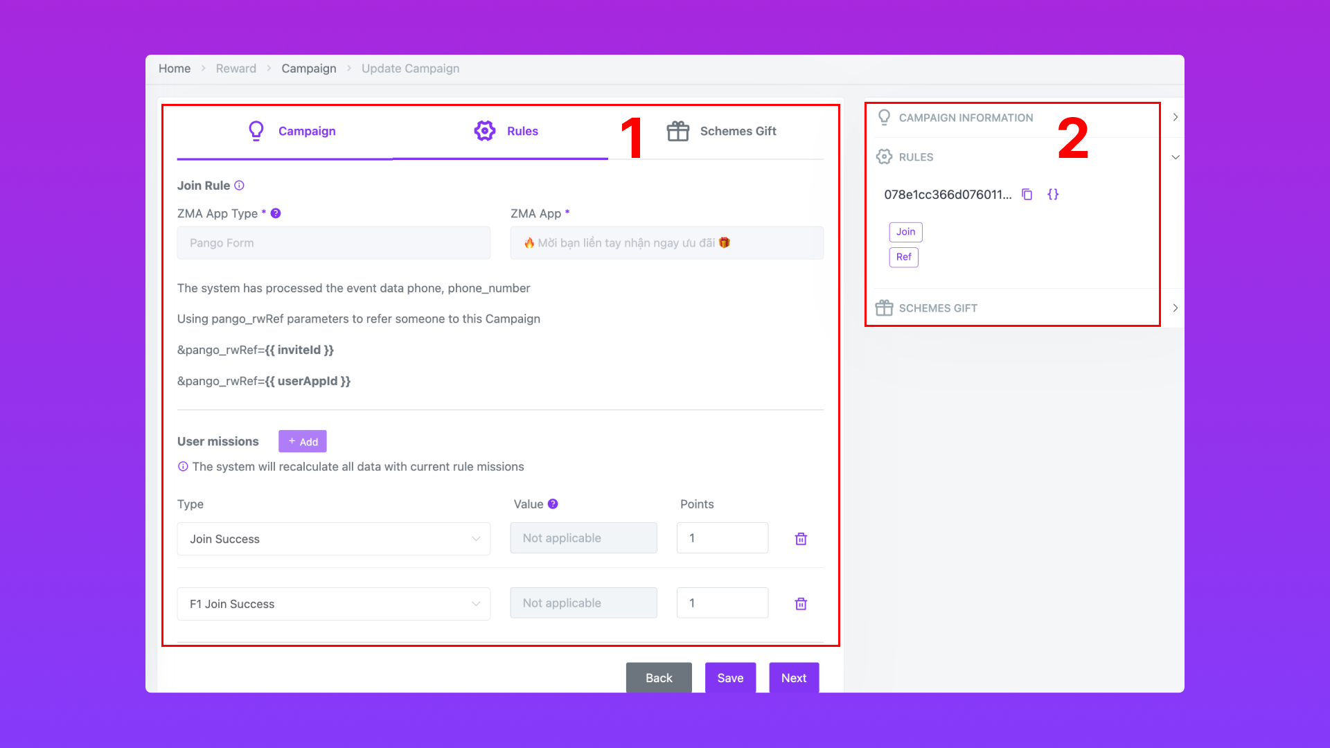 (1): Các cửa sổ liên quan đến cấu hình các trường dữ liệu campaign Reward - Dữ liệu đầu vào.