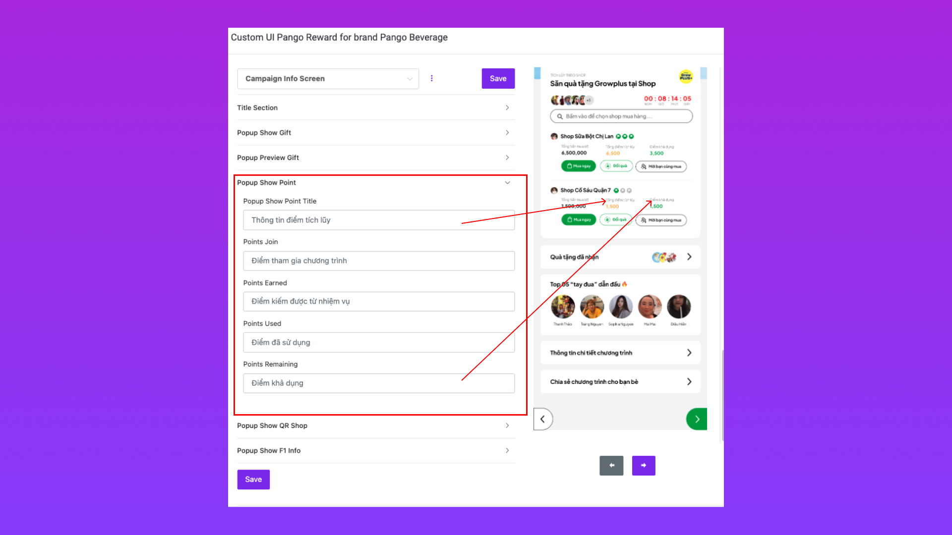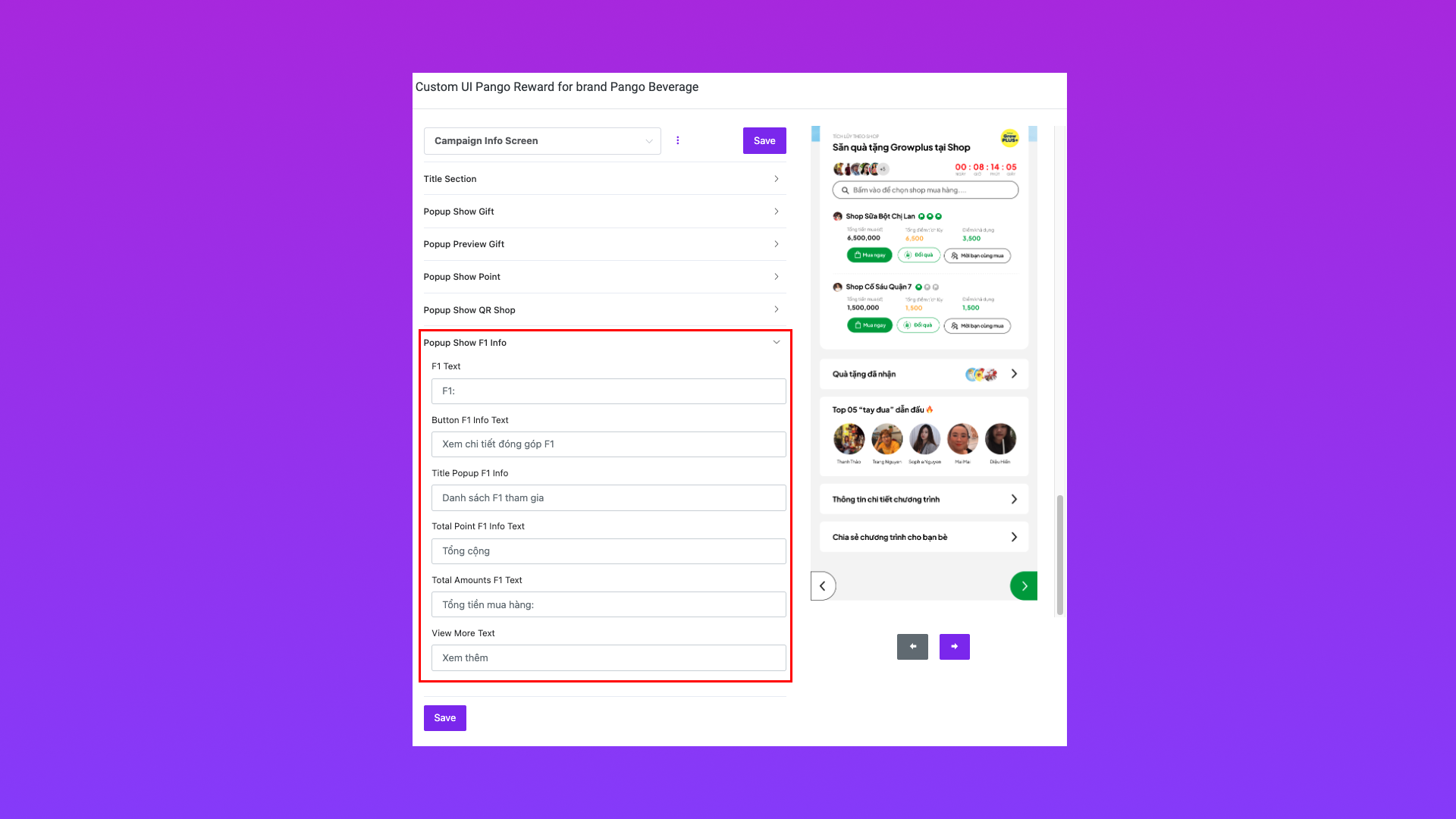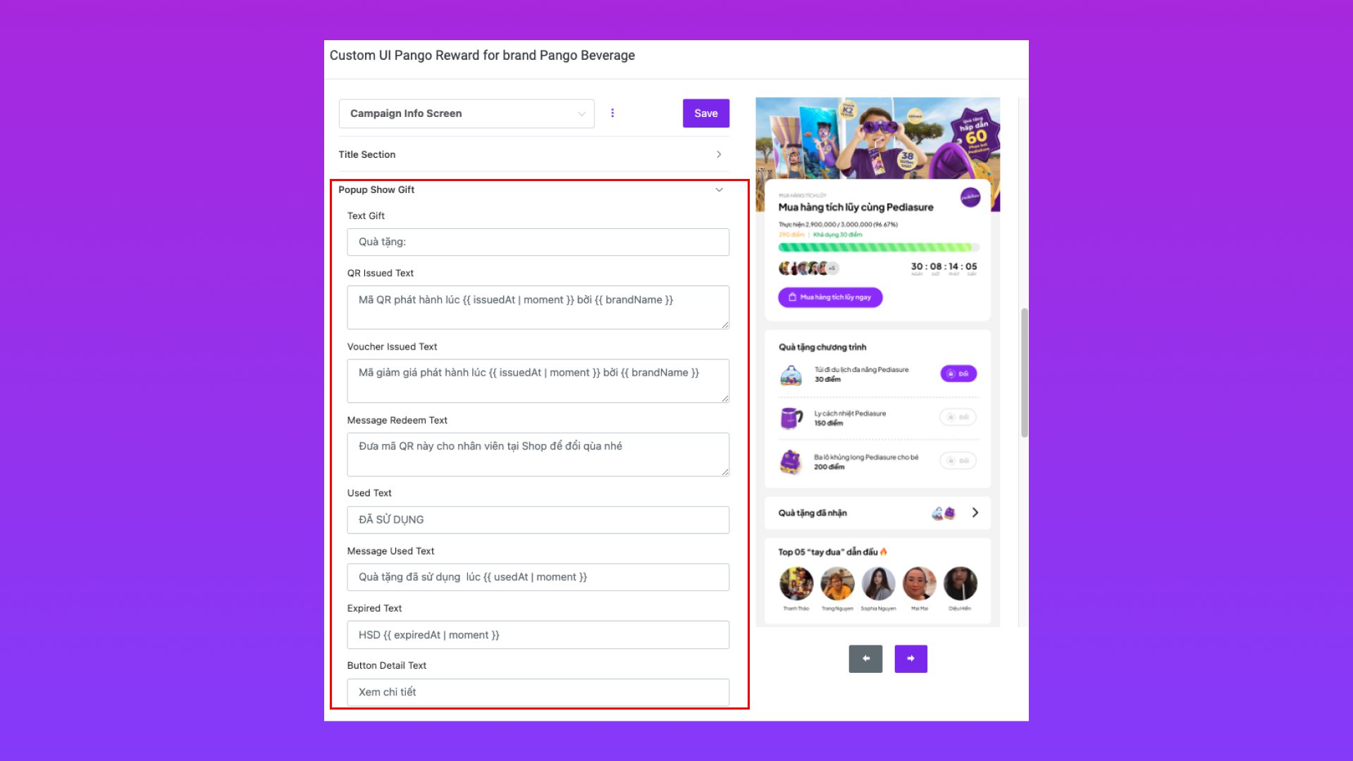Tài liệu hướng dẫn bạn cách cấu hình Custom UI - Campaign Info Screen của Pango Reward tại PangoCDP.