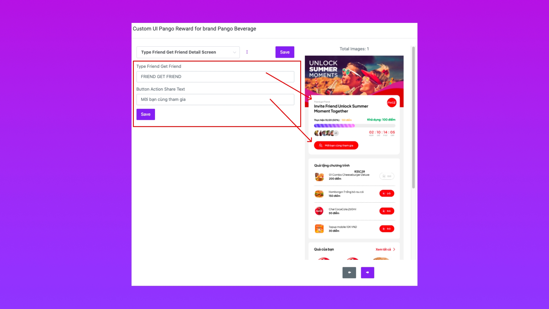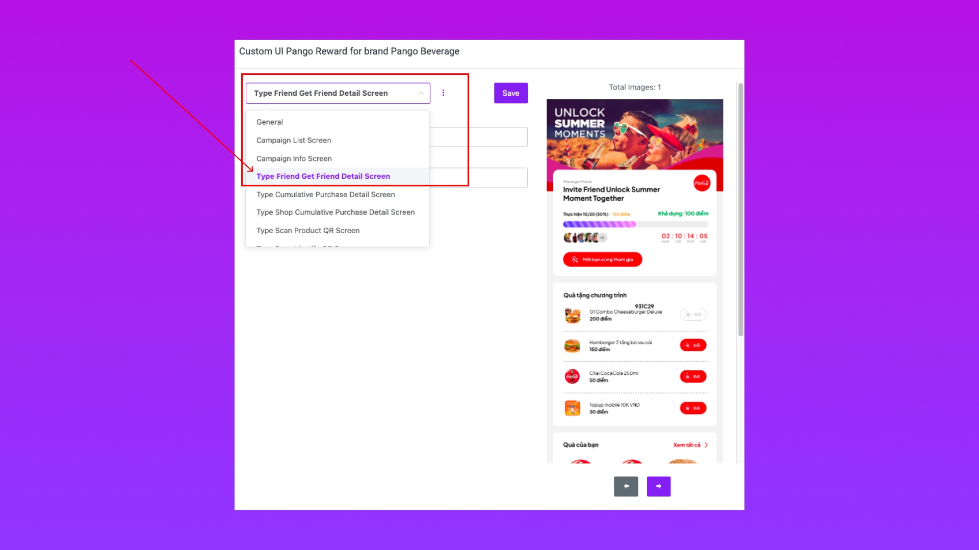 Nhấn nút "Save" để lưu thông tin phần "Type Friend Get Friend Detail Screen" và nút "Next" để chuyển sang giao diện cấu hình UI - "Type Cumulative Purchase Detail Screen".