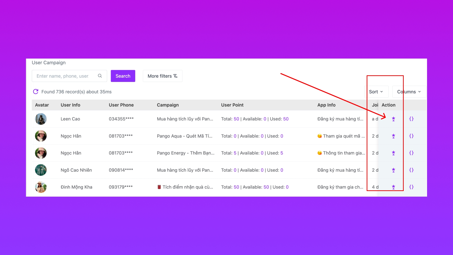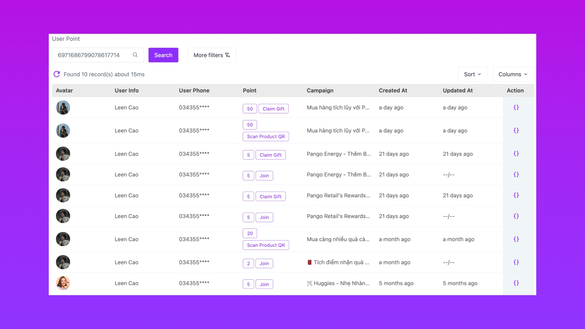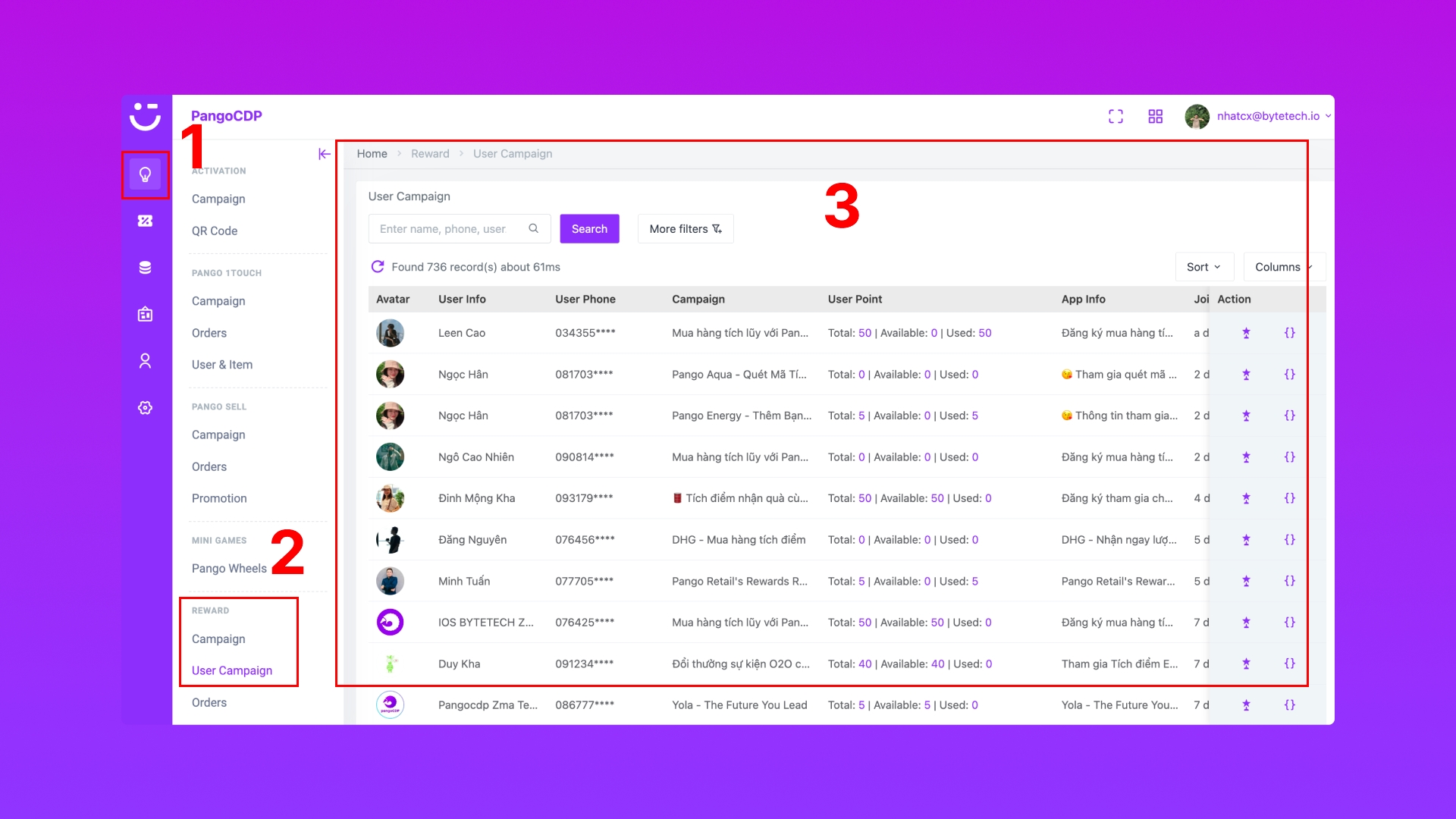 Tại giao diện User Campaign, hệ thống cập nhật thông tin của Users thành danh sách từ tất cả các Campaign Reward.