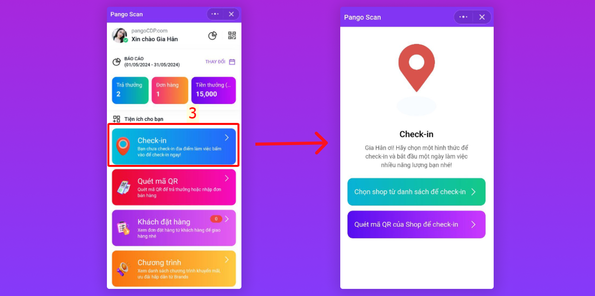 Khi bấm vào nút "Check-in" (3) sẽ chuyển sang các màn hình dành cho hoạt động check-in. Cấu hình custom UI cho các màn hình này tại link tài liệu "Hướng dẫn cấu hình PangoScan Custom UI - Check-in Screen"