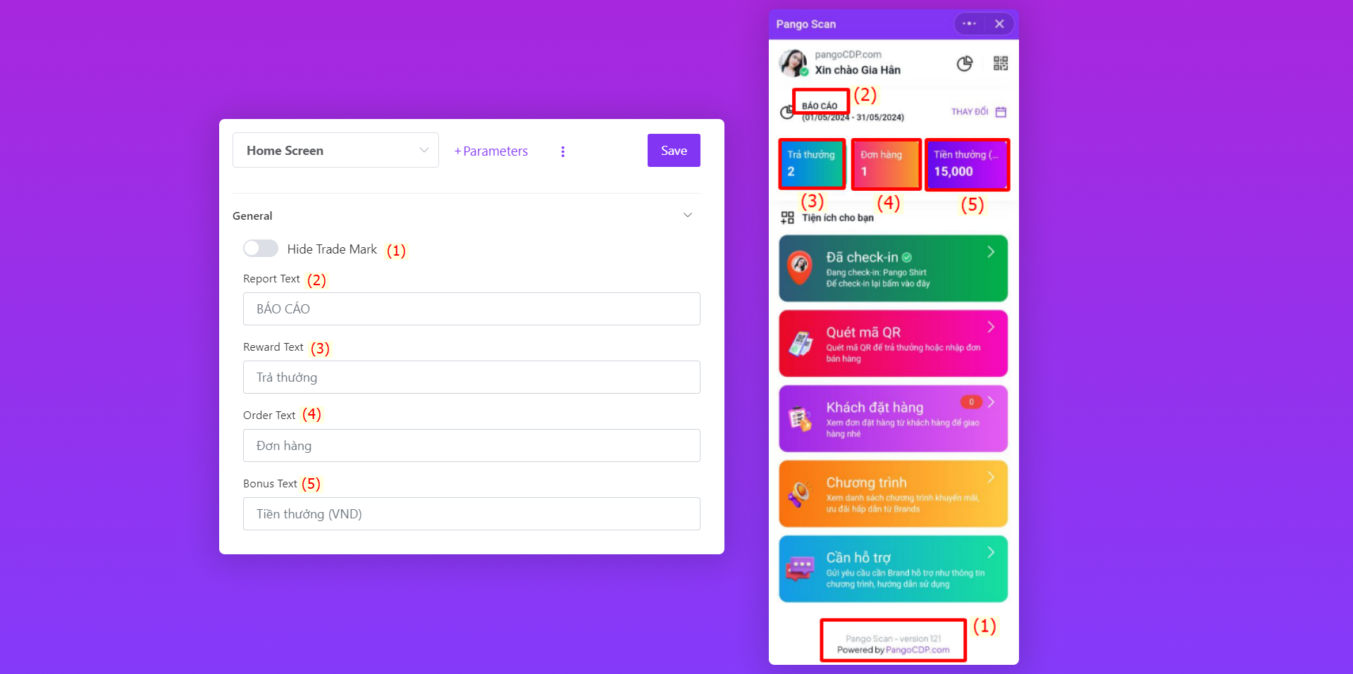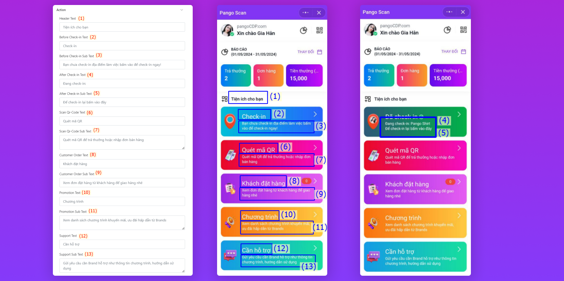 Thay đổi tên dòng tiêu đề phía trên các nút tiện ích PG/shop có thể sử dụng cho các hoạt động khác nhau trên Pango Scan như check-in, quét mã QR trả sampling/gift,...