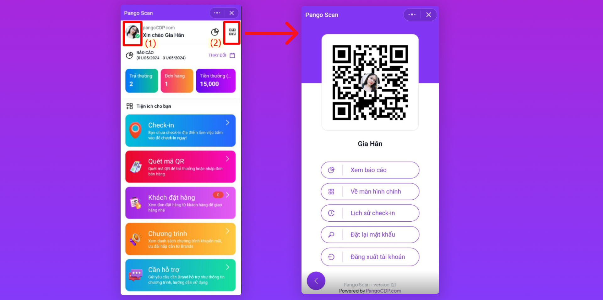 Khi PG/Shop bấm vào avatar trên góc trái màn hình (1) hoặc bấm vào icon QR trên góc phải màn hình (2) sẽ vào màn hình My QR (thông tin tài khoản của PG/shop). Cấu hình custom UI cho màn hình My QR tại link tài liệu "Hướng dẫn cấu hình PangoScan Custom UI - My QR Screen".