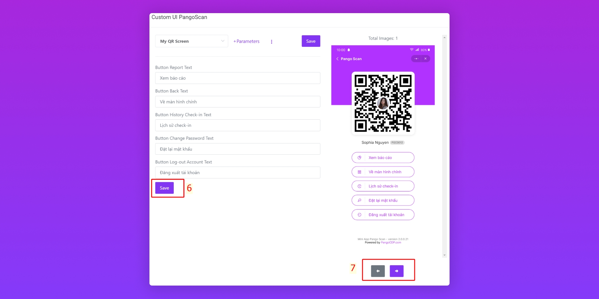 Sau khi chỉnh sửa xong cho màn hình My QR thì bấm nút Save (6) để lưu lại. Có thể bấm mũi tên trái phải (7) để chuyển sang cấu hình cho màn hình tiếp theo.