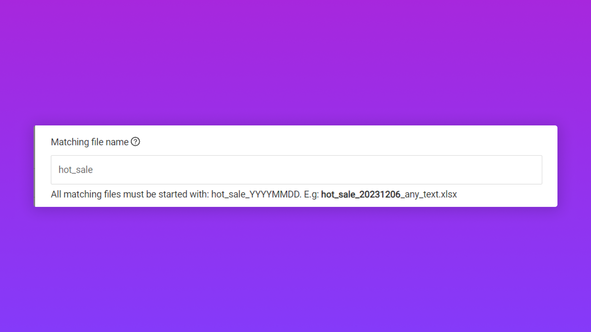 Đặt tên file trên Drive theo cấu trúc như: name_YYYYMMDD_text.xlsx Vd: như hình trên đang chọn matching file name là “hot_sale” thì tên những files ở Drive sẽ là hot_sale_20231206_01.xlsx; hot_sale_20231206_02.xlsx; hot_sale_20231207_01.xlsx;....