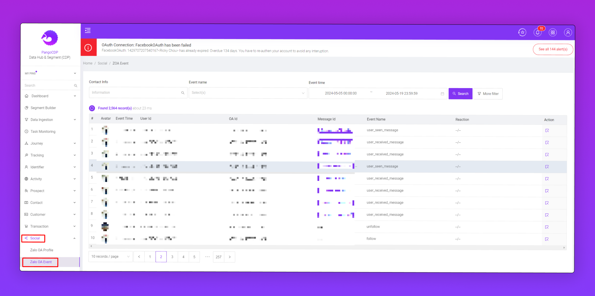 Model Zalo OA Event trên PangoCDP là 1 bảng lưu trữ dữ dữ liệu về các tương tác của một account Zalo tương tác với OA của brand
