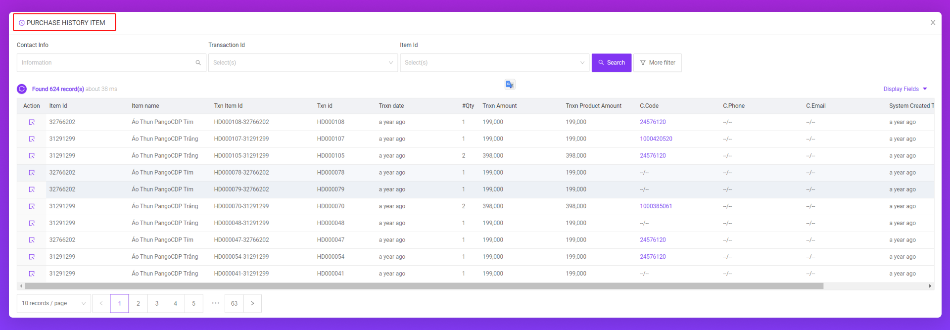 Model Purchase History Item là bảng lưu trữ dự liệu chi tiết của những đơn hàng đã được hoàn thành (tất cả sản phảm trong đơn hàng) trên PangoCDP