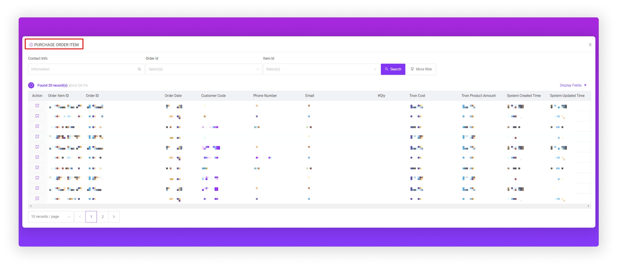 Model Purchase Order Item là bảng lưu trữ dữ liệu chi tiết của những đơn hàng chưa được hoàn thành (tất cả sản phảm trong đơn hàng) trên PangoCDP