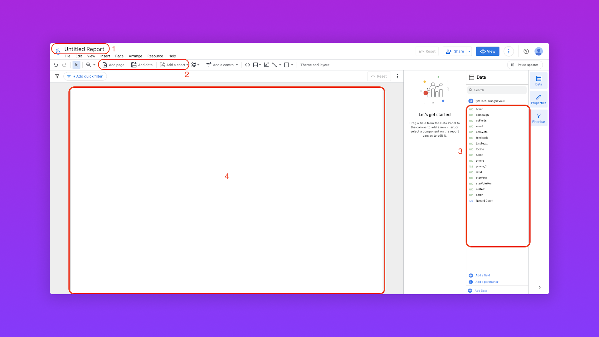 Add chart: Một trong những phần quan trọng nhất của report - chart. Đây là button để có thể thêm nhiều loại chart vào phần report(4) bên dưới để trực quan hoá dữ liệu