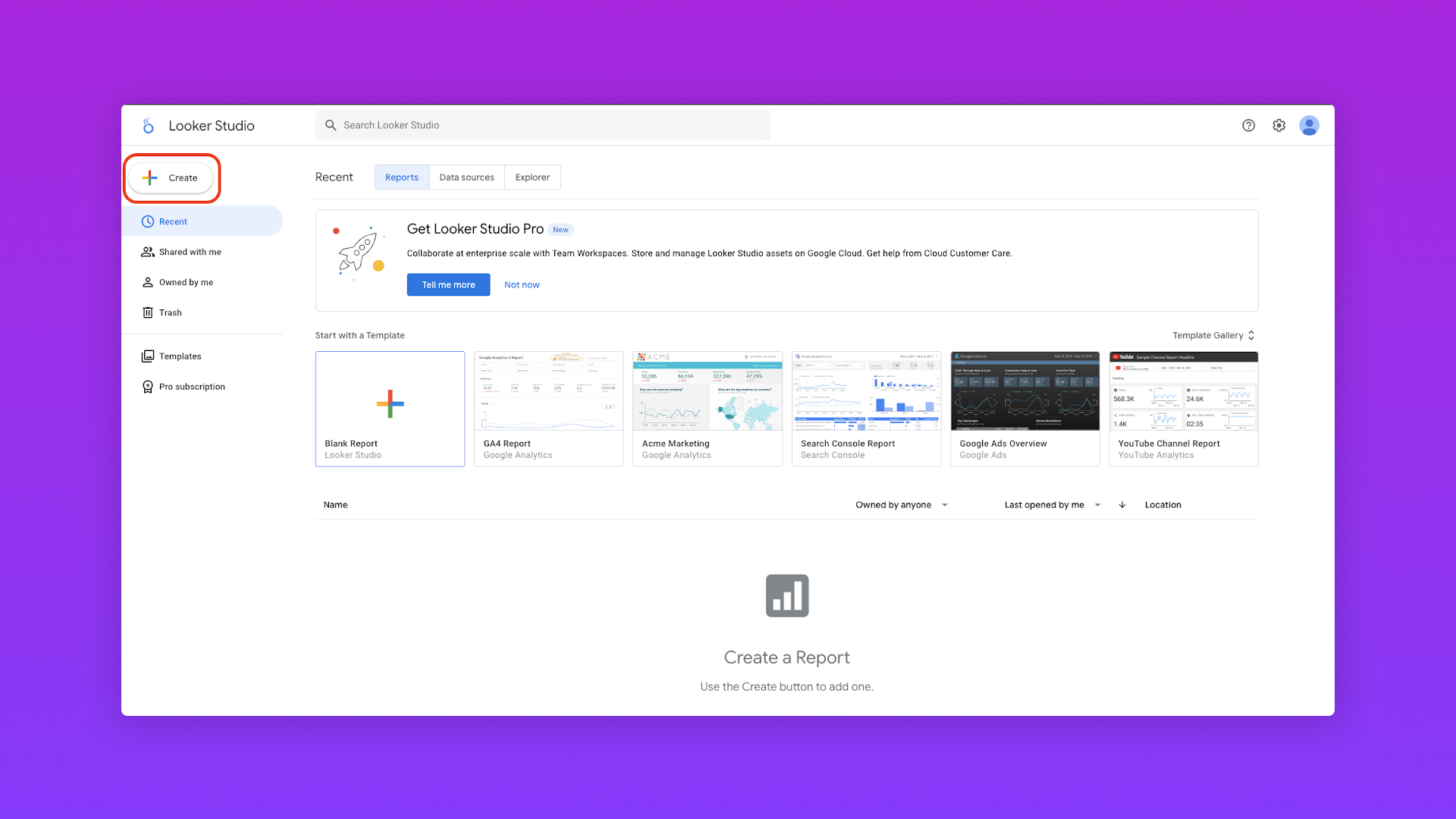 Chọn “Create” và chọn vào “Report"