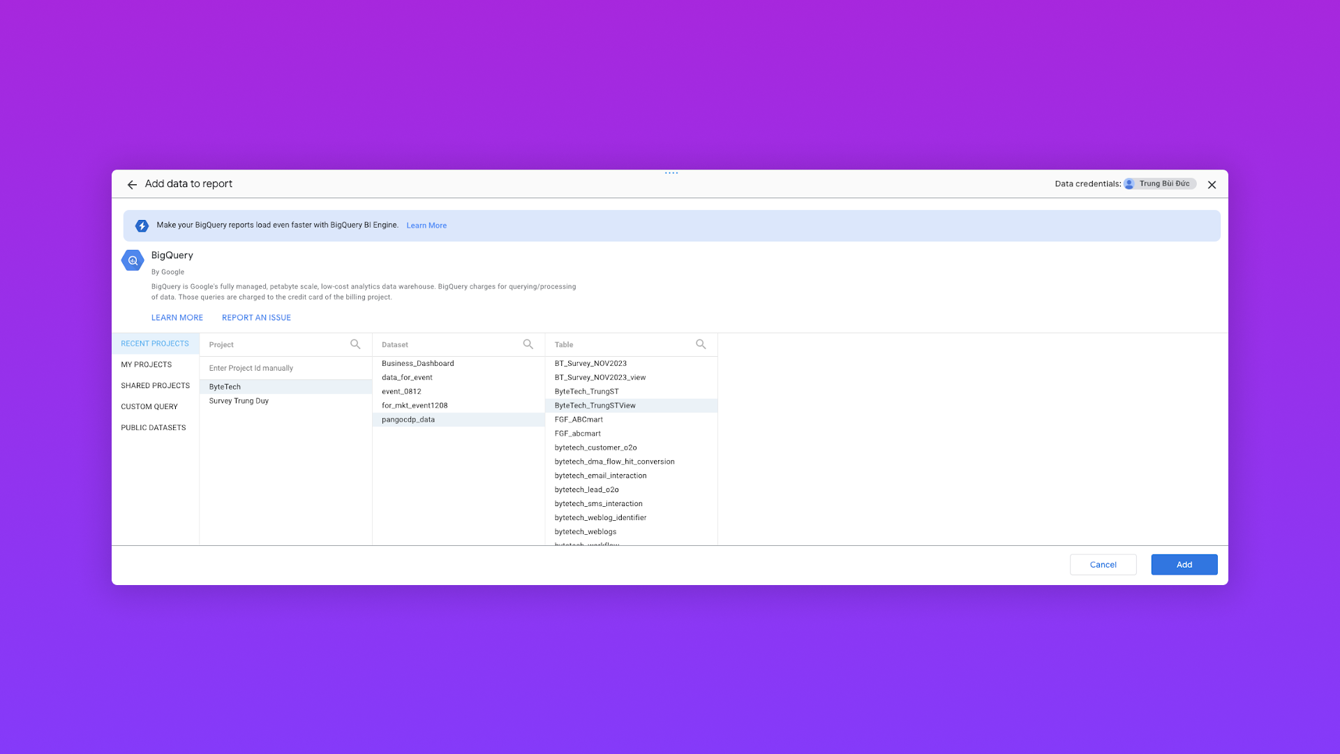 Chọn Dataset (Data này có thể đã được query SQL để chuẩn hóa) được push từ PangoCDP lên GG BQ