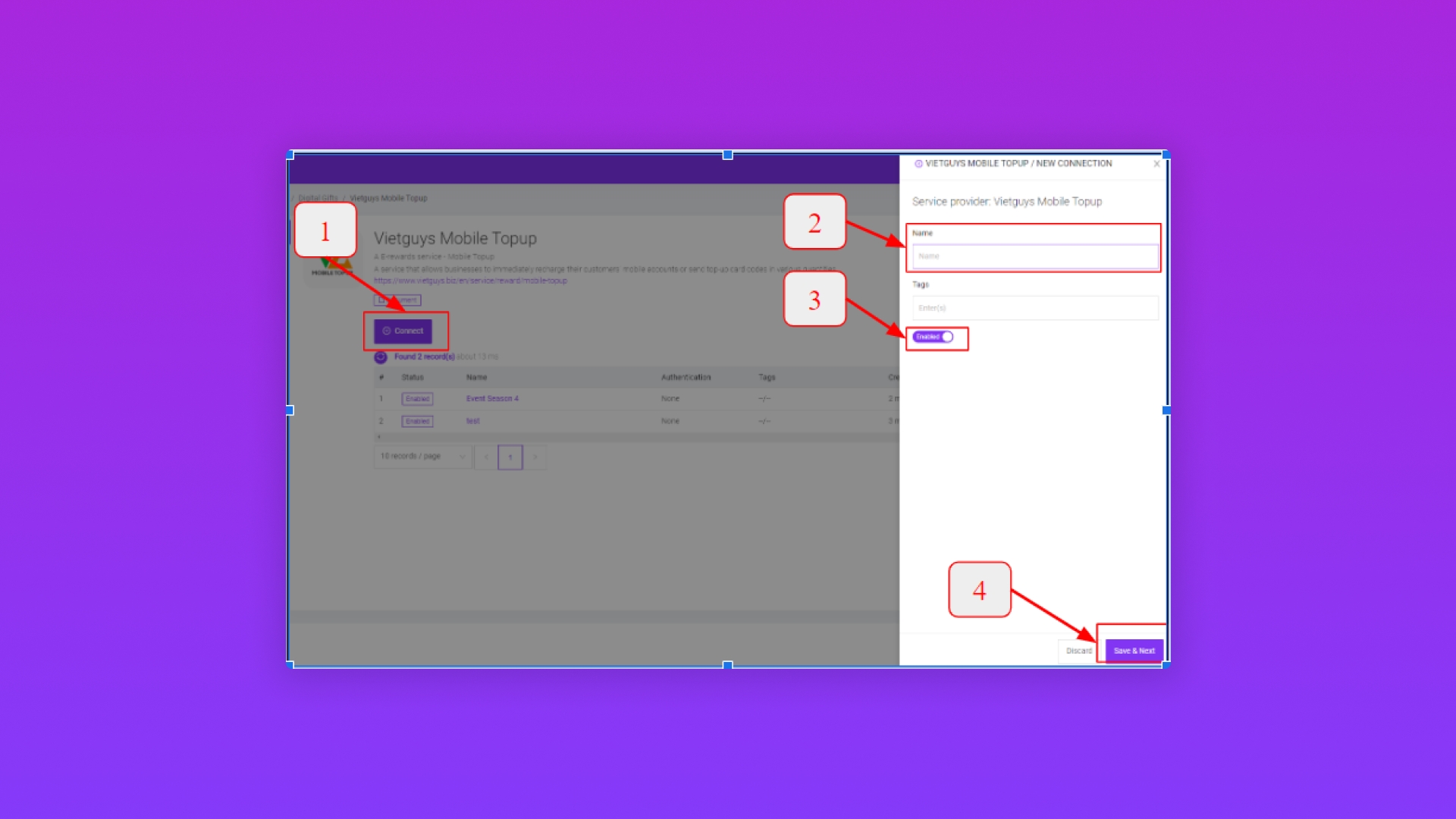 Bước 2. Tạo mới connect Vietguys Mobile Topup.