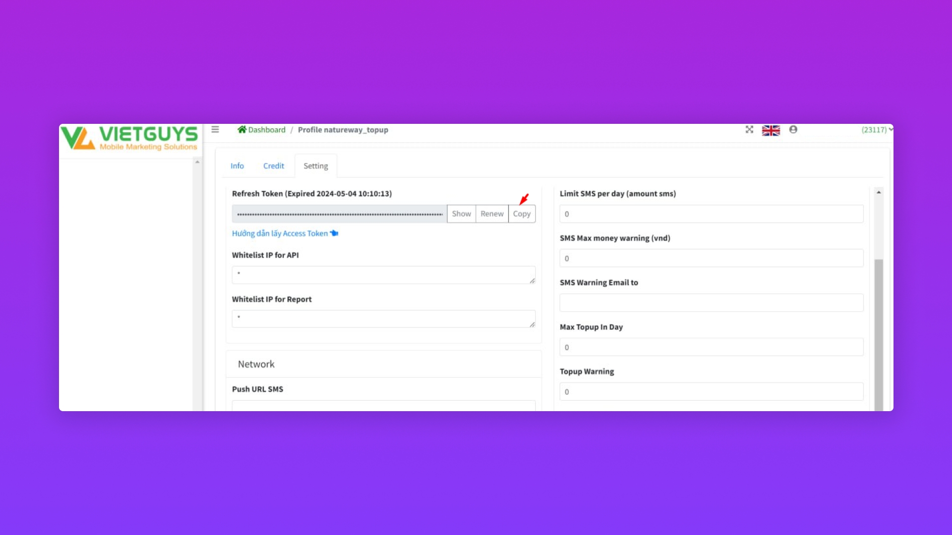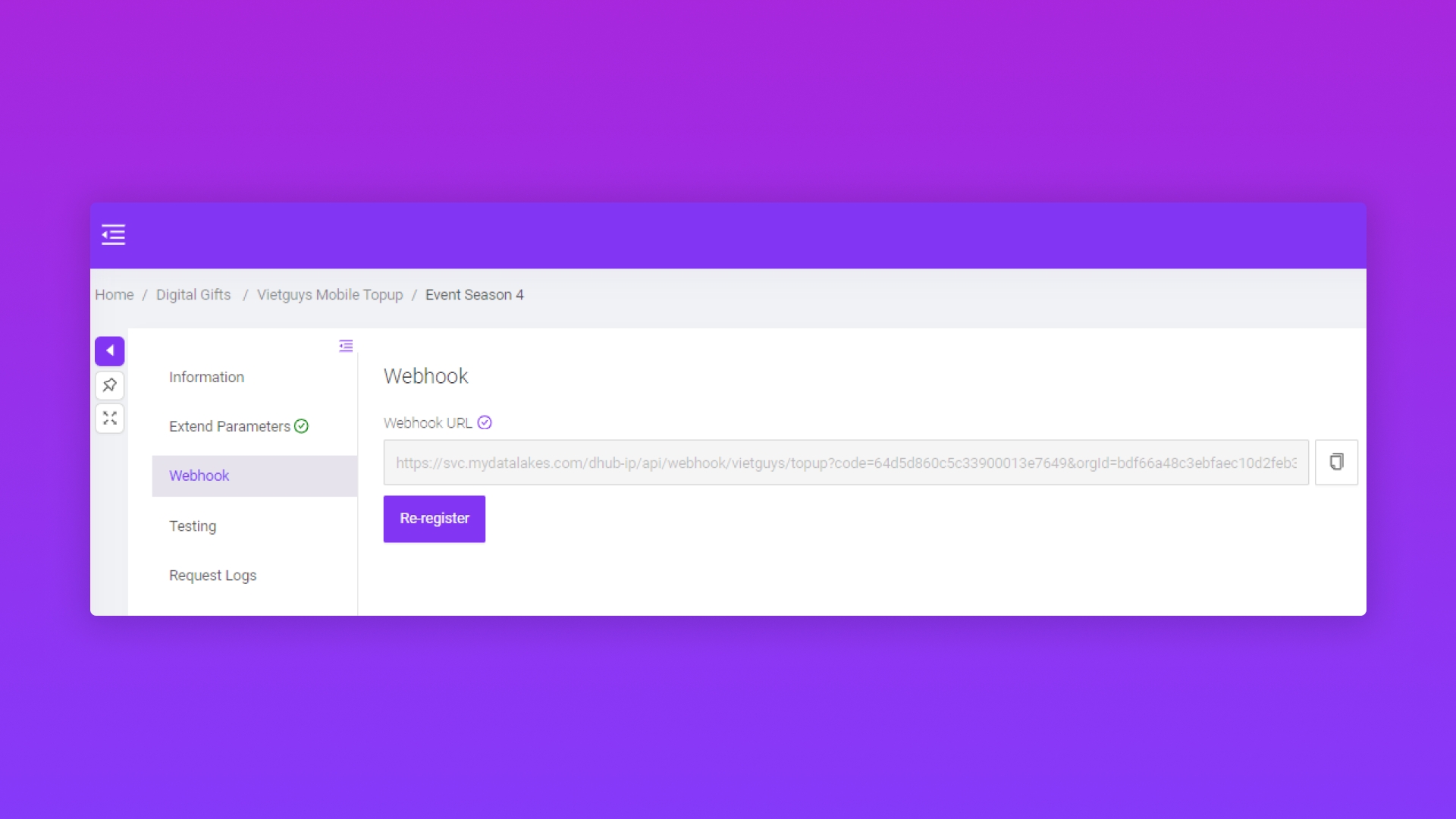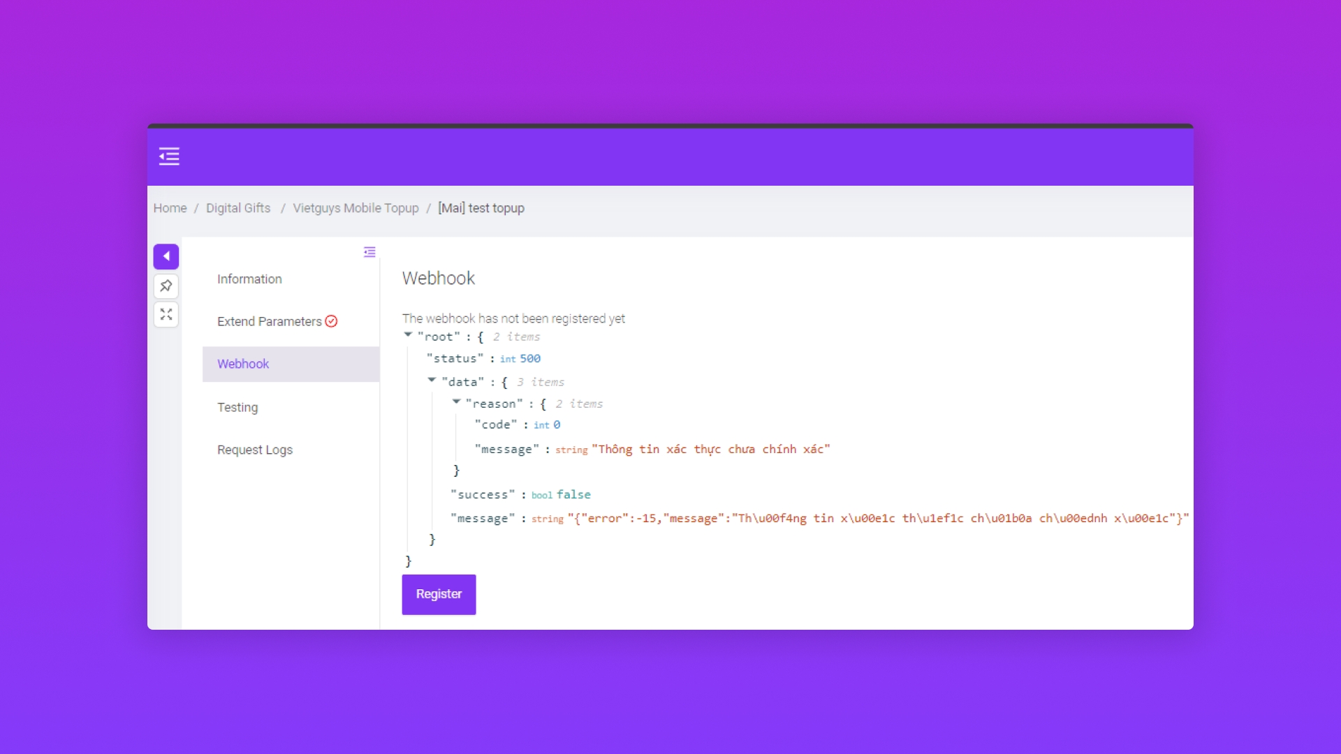 ⇒ Khi Vietguys Mobile Topup thành công sẽ hiển thị thông tin Webhook URL.