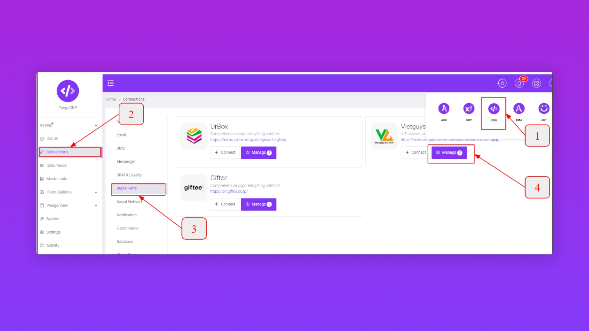Bước 1: Tạo đầu connect Topup trên PangoCDP