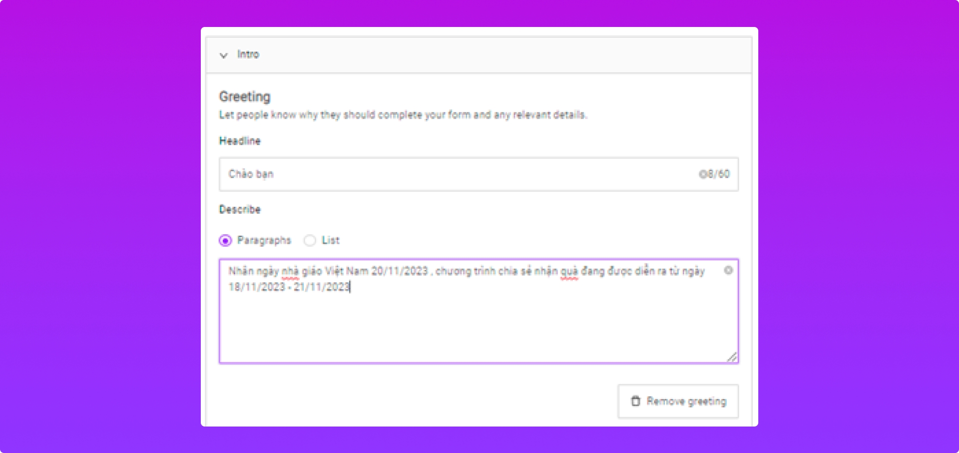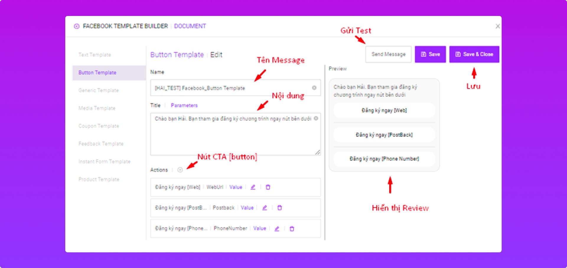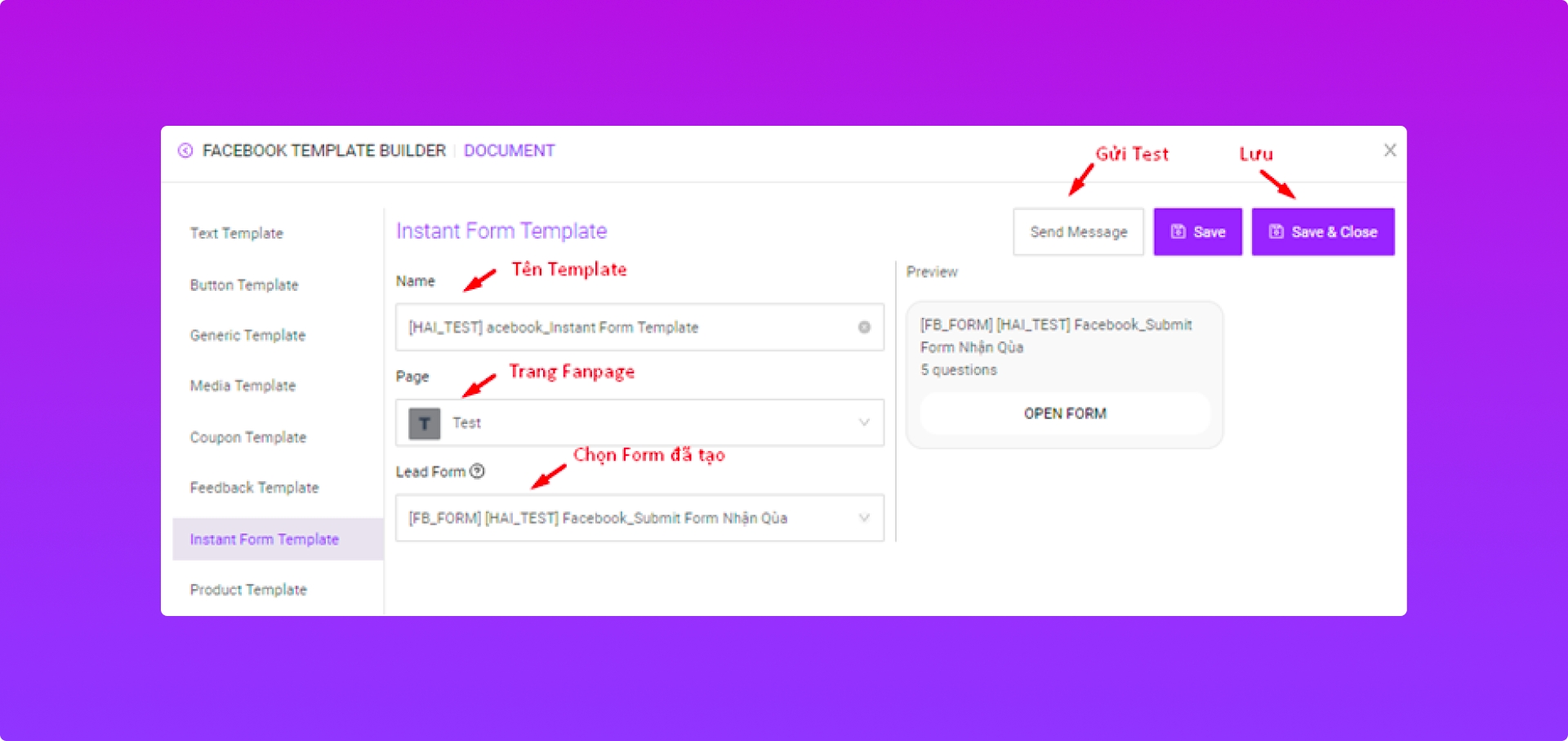 Tin nhắn gửi kèm Form đăng ký được tạo từ Fanpage Facebook. Để có Form truyền vào tin nhắn thì cần phải tạo Instant Form như sau: