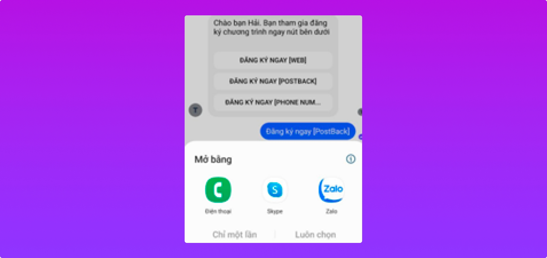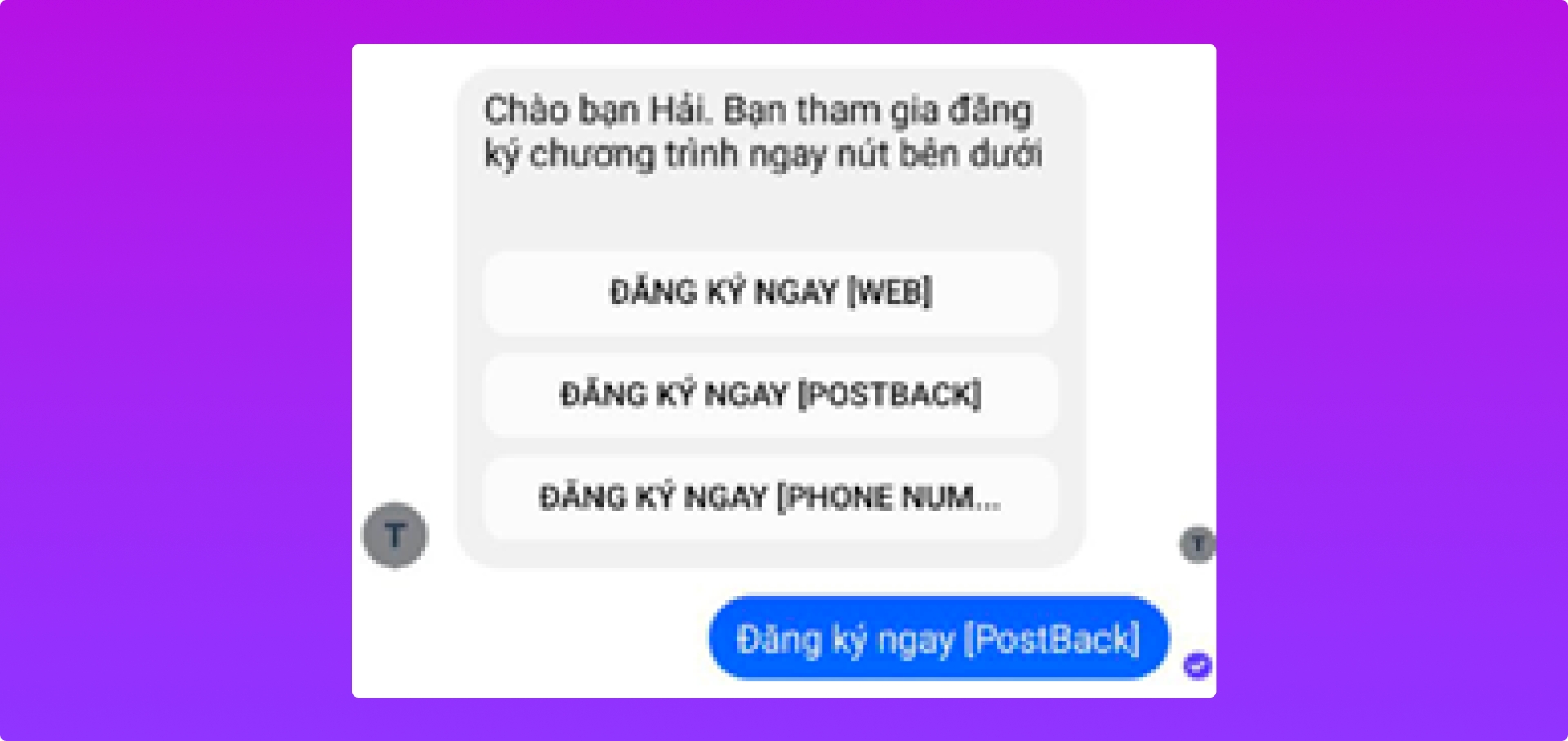PostBack: Khi User click vào sẽ phản hồi Reply nội dung y chang tới Fanpage (thường được dùng như Gửi Menu).