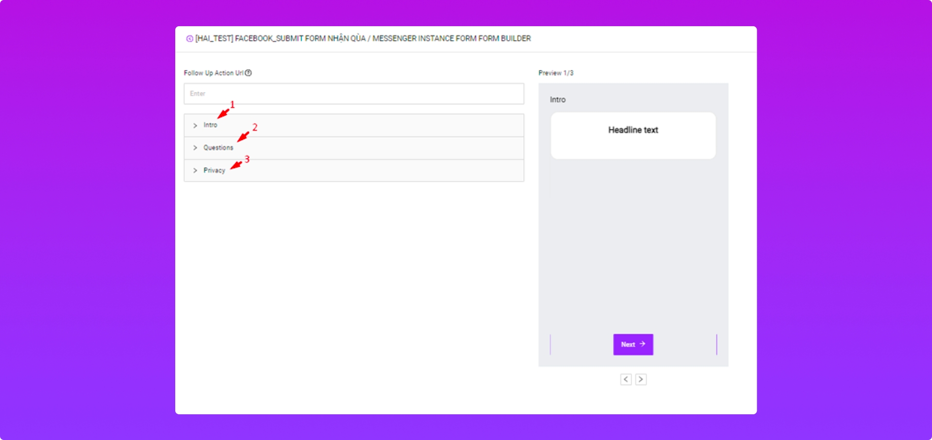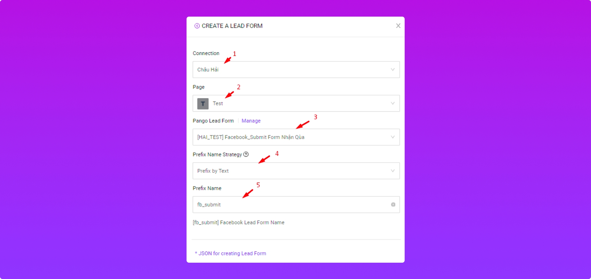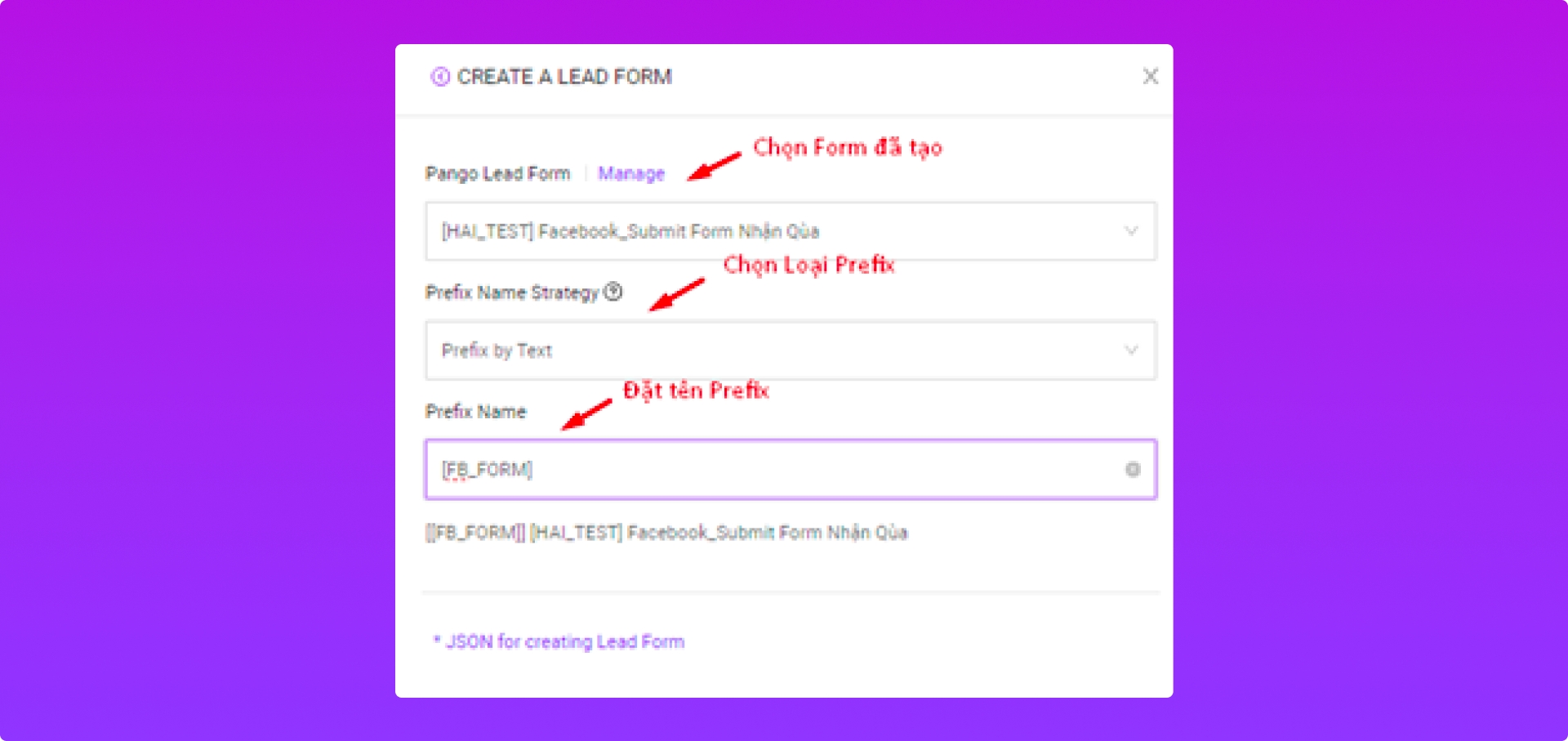 Tạo Form get value từ Form Fanpage đã được Push ở trên.