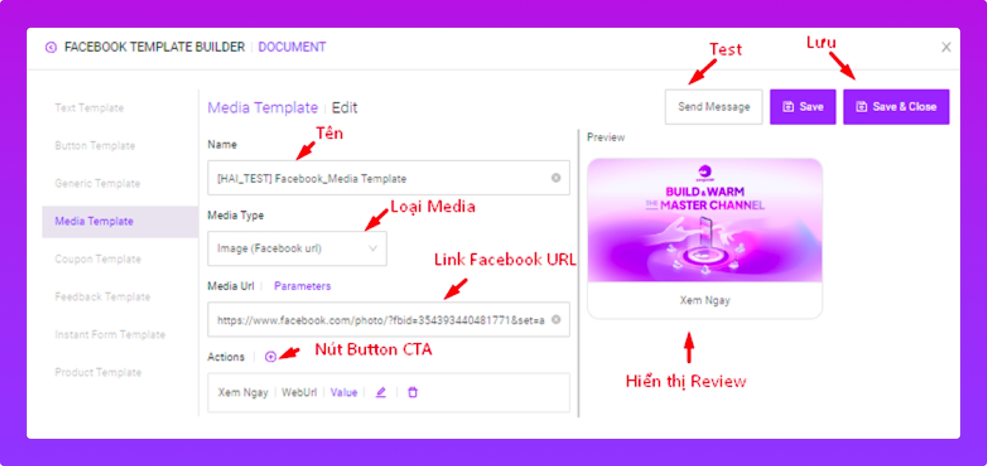 Tin nhắn kèm hình ảnh hoặc video đính kèm trên Banner tin nhắn. Tuy nhiên với loại tin nhắn này thì cần phải dùng URL đúng của Image / Video trên Facebook.