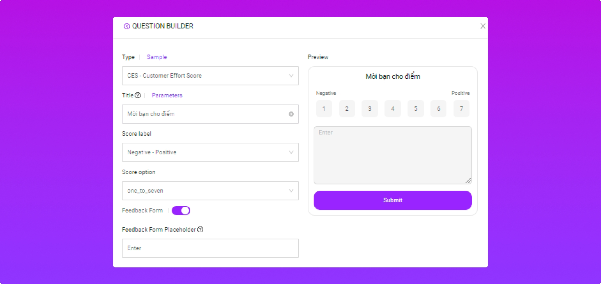 CES: Customer Effort Score (type: Vote Rating by Number).