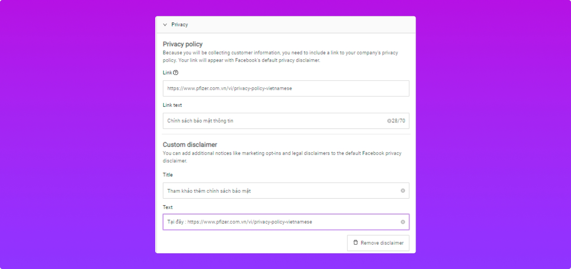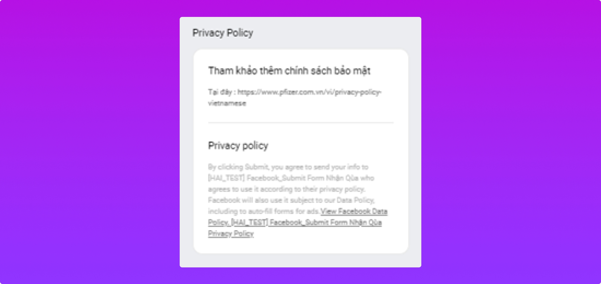 Privacy: Bổ sung các thông tin liên quan đến chính sách bảo mật Facebook.