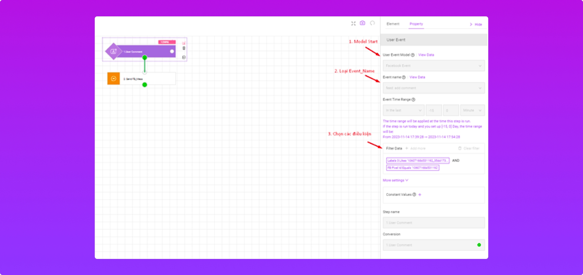 Để có thể tạo Flow DMA thì cần phải tạo các Model lưu trữ thông tin action của User trên Facebook. Trong đó cần lưu ý một số giá trị của các biến như sau: