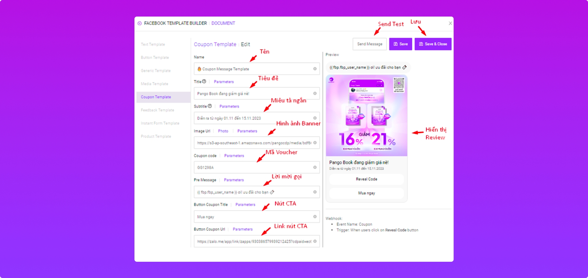 Tin nhắn kèm được gửi đính kèm Voucher và nút Button CTA.