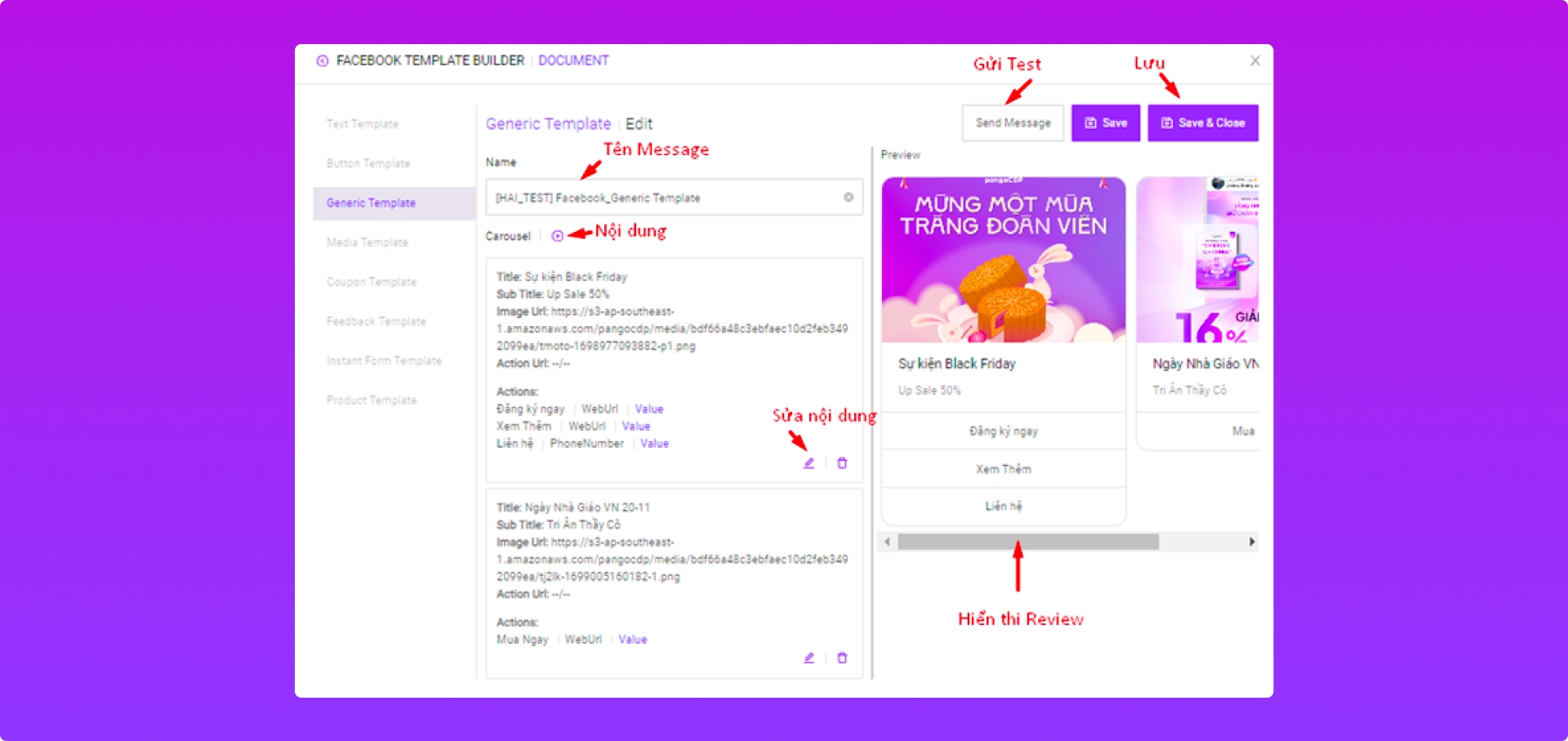 Tin nhắn tương tự Button Template nhưng có thêm hình ảnh và hiển thị dạng slide ngang với nhiều Carousel.